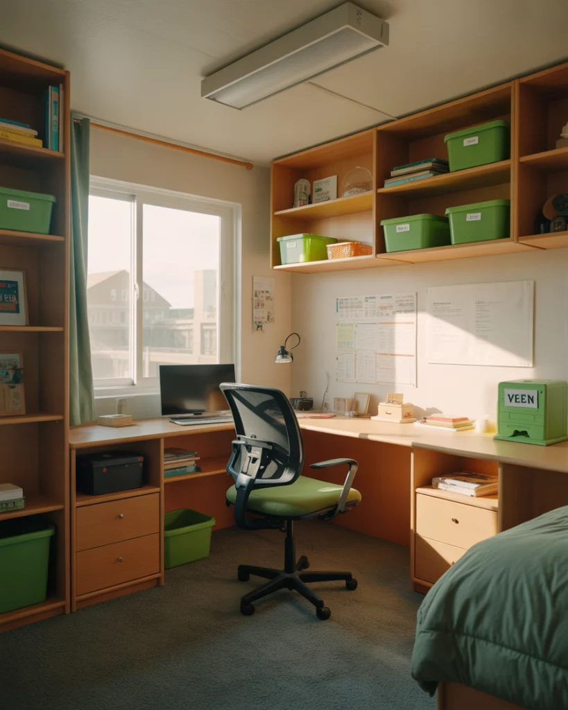 This idea blends green tones with smart organization to create a dorm that feels both fresh and efficient. Open shelving, coordinated bins, and color-coded storage keep daily essentials accessible while maintaining a calm visual rhythm. A practical insight: when storage is visible, cohesion matters more than quantity. Matching containers reduce visual noise and encourage students to keep systems intact throughout the semester.