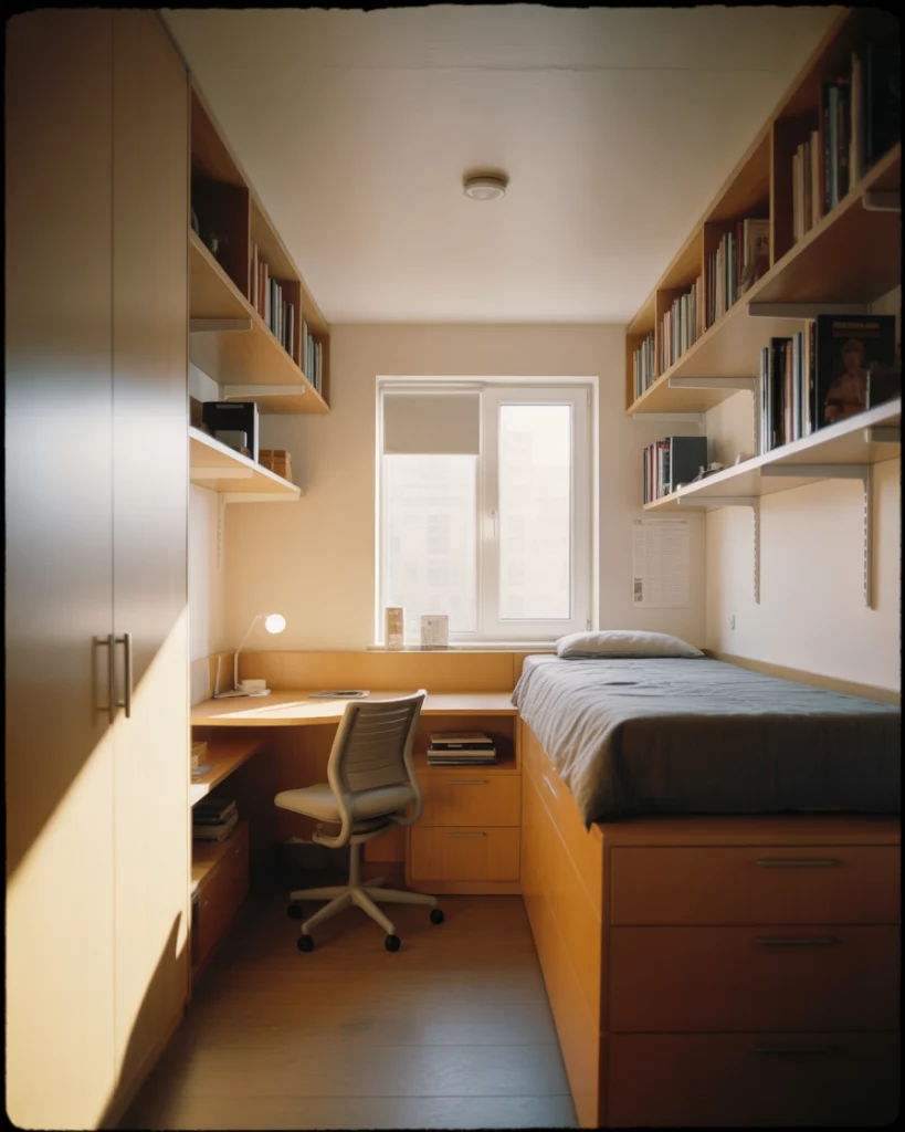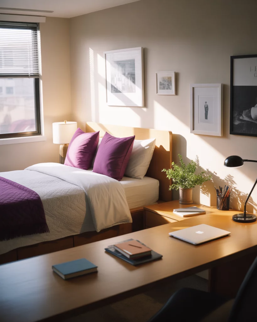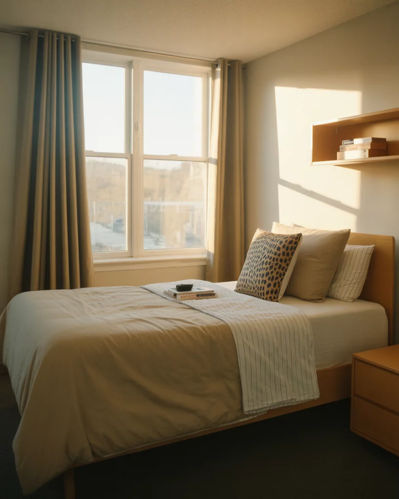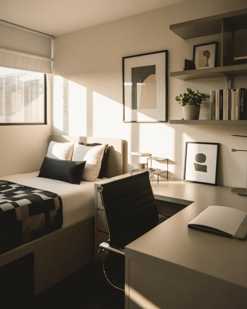Using a lofted bed transforms how a dorm functions. By lifting the bed, students gain space for seating, storage, or a desk underneath. This approach is especially popular for small room setups where every square foot needs to earn its place. A common mistake is overcrowding the area beneath the bed. Keeping one clear function—study or lounge—prevents the space from feeling cramped and maintains good airflow, which matters more than students expect.