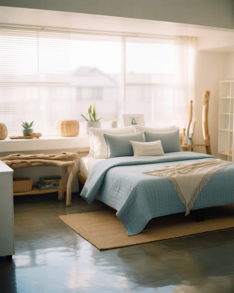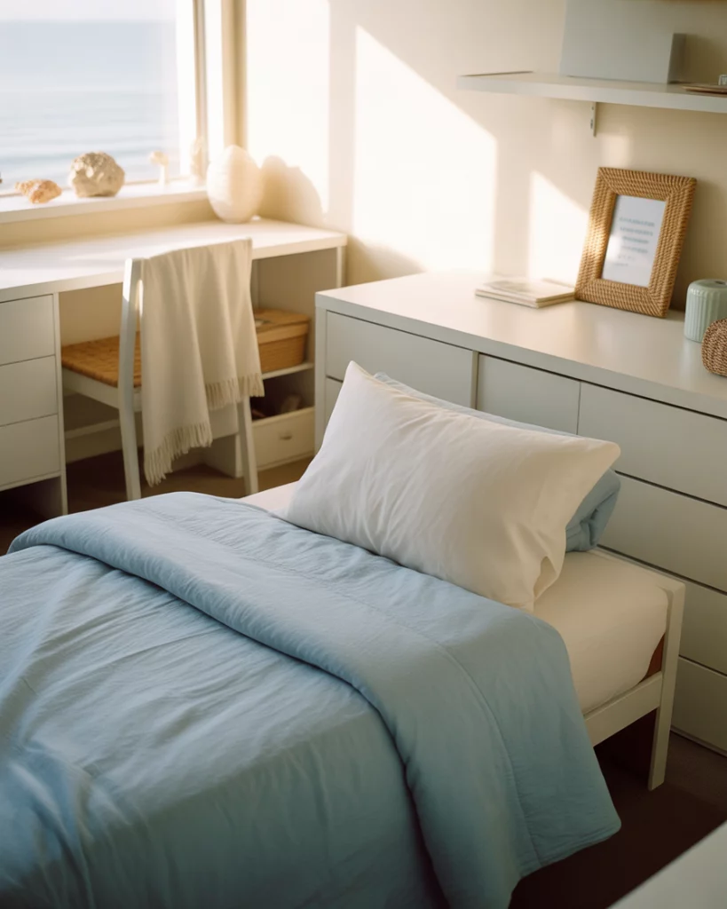 A laid-back, beach-inspired dorm uses soft neutrals, light blues, and natural textures to create an easygoing vibe. The look feels airy and relaxed without relying on obvious coastal motifs. Where it works best is in high-stress academic programs. Visual softness can subtly counterbalance intense schedules and long study hours.