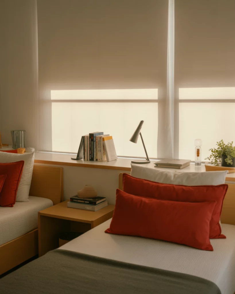 A double dorm styled in soft neutral tones instantly feels calmer and more spacious. Layered whites, beiges, and light wood finishes create visual continuity between roommates while still allowing personal accents. This approach works well for students who want a grown-up look without sacrificing warmth or comfort. Where it works best is in older dorm buildings with mismatched finishes. A neutral palette smooths out inconsistencies and makes the room feel intentionally designed rather than patched together.
