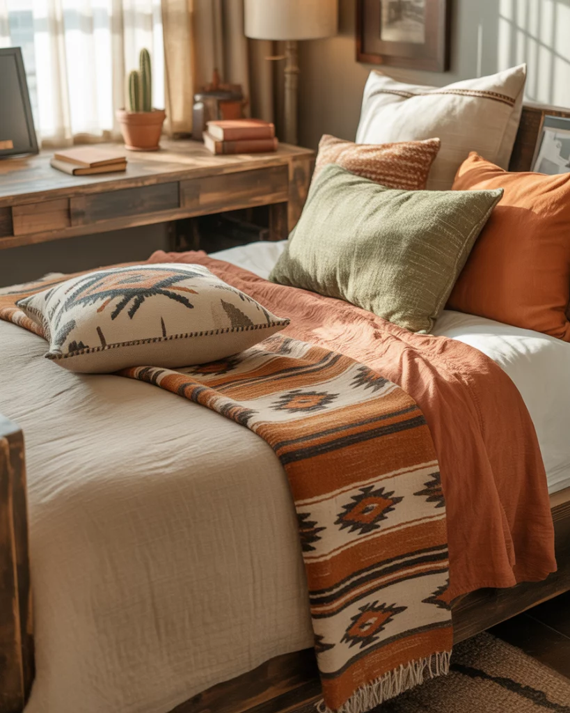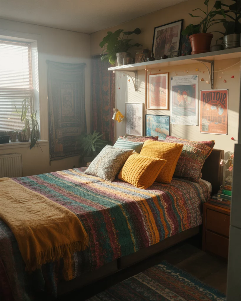 This look blends western influences with a cozy, dorm-friendly approach. Warm browns, subtle patterns, and textured throws create a grounded vibe that feels personal rather than themed. It’s a fresh alternative to standard minimalist dorm styles. Where it works best is in colder regions where students naturally gravitate toward warmer visuals. This style adds visual warmth even when the heating system is unreliable.