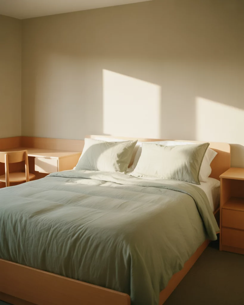 This triple dorm uses subtle color variation and layout planning to define personal zones. Each bed area feels distinct, while shared storage and lighting maintain cohesion across the room. A micro anecdote often heard from students: once zones are visually clear, roommate conflicts tend to drop. Design quietly supports better communication.