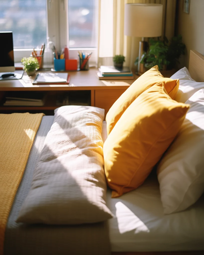 When used thoughtfully, yellow can completely change the mood of a college dorm. This idea layers sunny accents—pillows, throws, or desk accessories—into a mostly neutral base. The result feels optimistic and energizing without overwhelming a small space. Where it works best is in northern campuses with long winters. A touch of yellow compensates for limited daylight and subtly boosts mood during darker months.