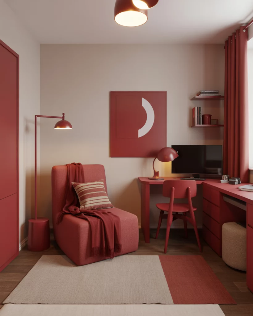 Using red sparingly can energize your space—perfect for productivity. A red desk chair, or an accent rug and a patterned blanket can bring the right amount of warmness. Play down the rest of the elements around it with white walls or wood furniture to make it pop. This is a decent selection that can suit loud personalities who would want their room to be kinetic and prepared. Recommended by design columnist Maxwell Ryan of Apartment Therapy.