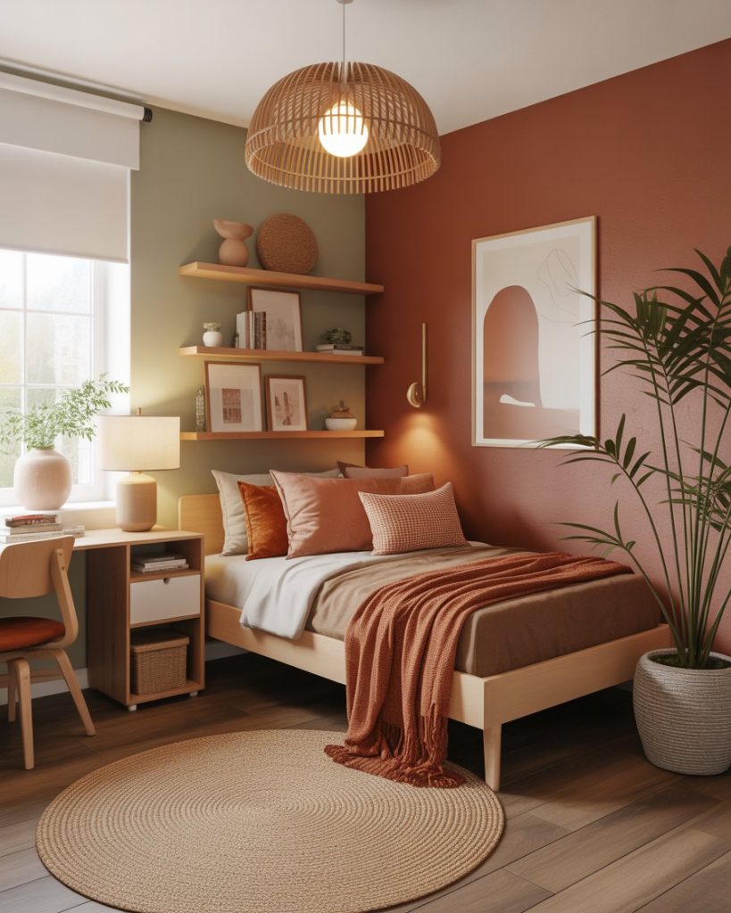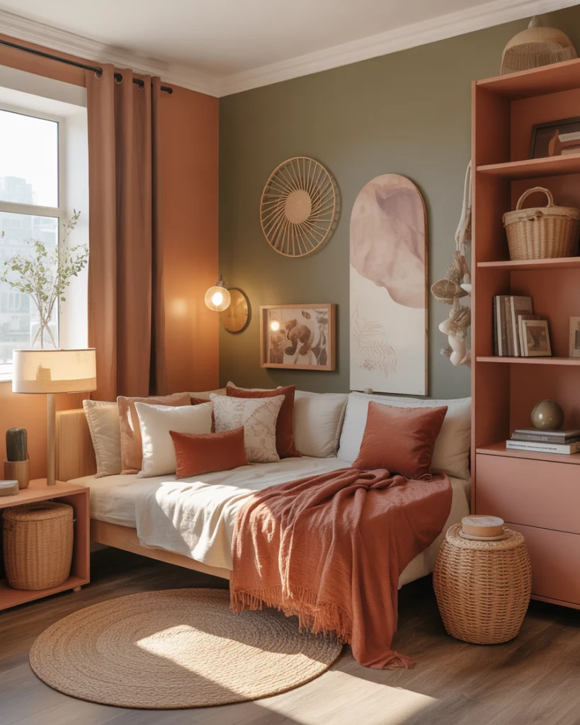 Decorating your dorm with color schemes cozy rooted in earthy tones—like terracotta, beige, and muted green—creates a grounded and welcoming environment. Such shades are aesthetic comfy and are also known to mitigate stress. Add woven baskets, jute rugs and soft ambient lighting to add that warmth of natural. Ideal for anyone craving a calm escape from loud campus life, this look blends perfectly with boho or minimalist sensibilities.
