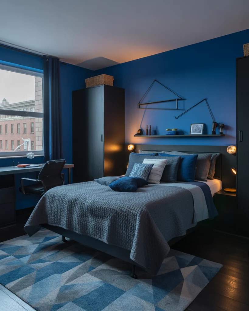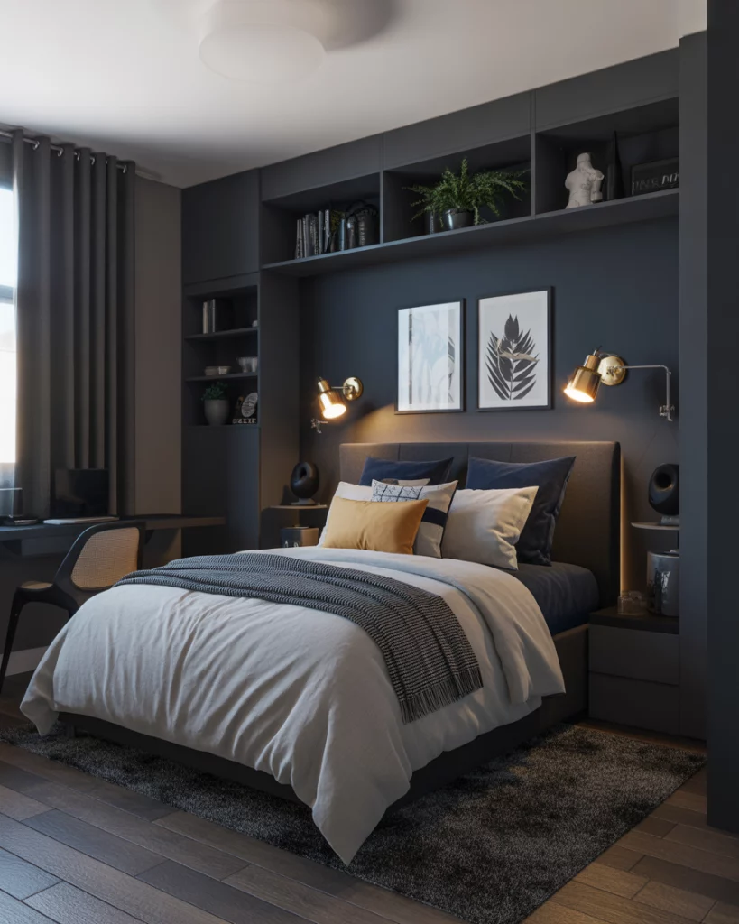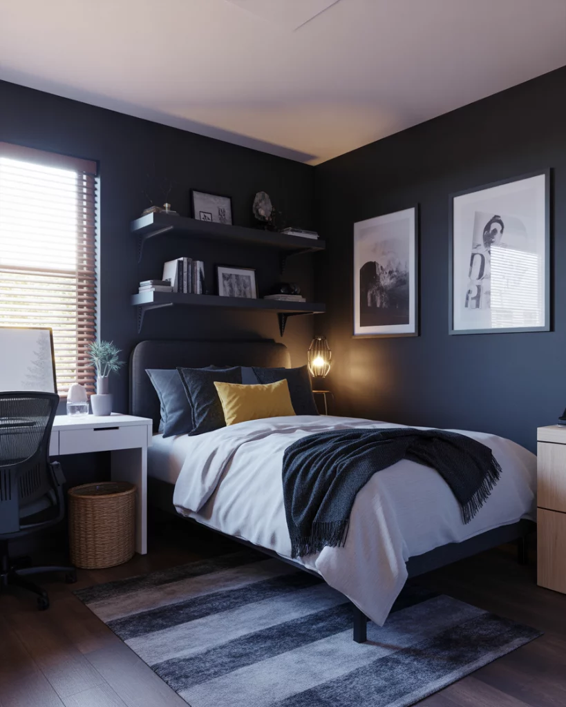A moody, modern dorm room uses darker wall tapestries or peel-and-stick wallpapers in black, charcoal, or deep blue, paired with lighter bedding and metallic accents. The contrast makes the space feel dramatic yet intimate. Great for guys or anyone who wants a cinematic, bold environment that still feels cozy and smart.