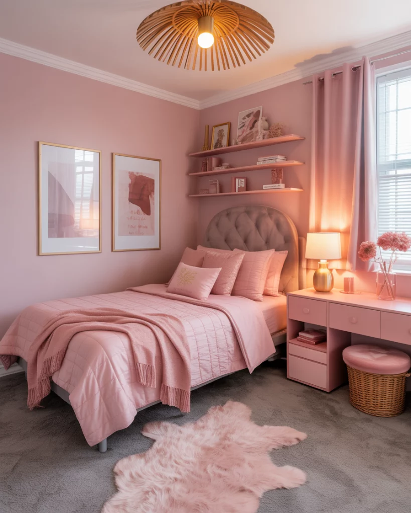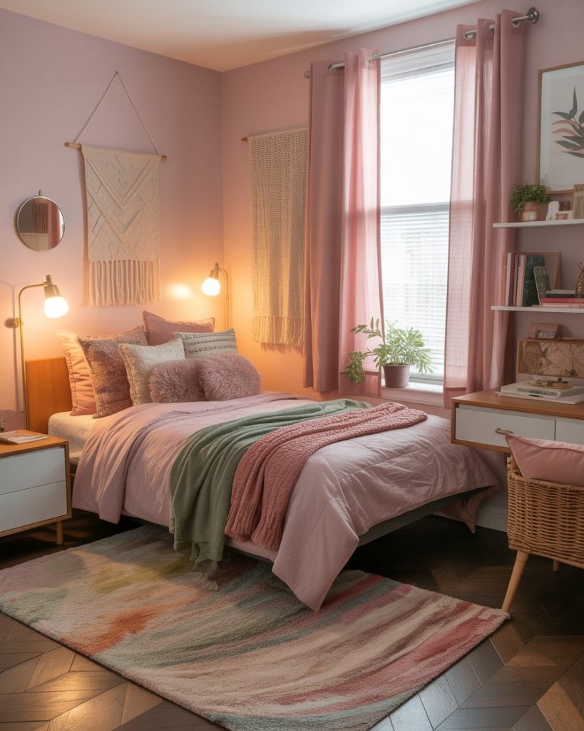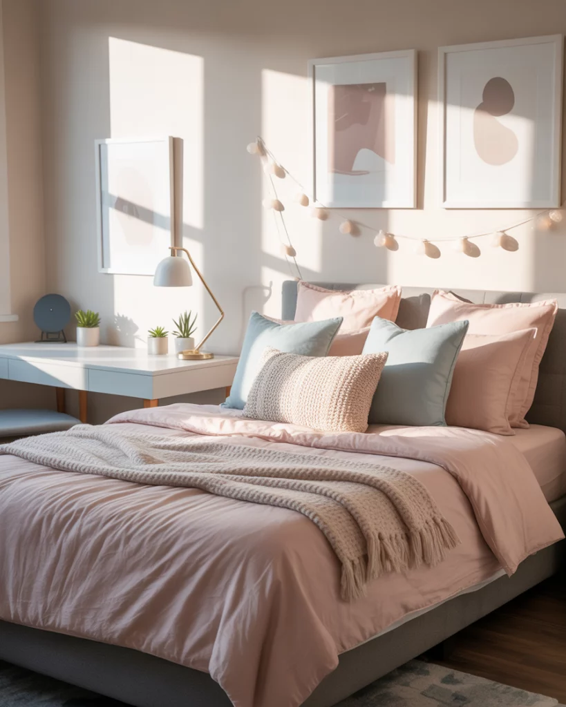 The classic pink and blue combo isn’t just for nurseries—it’s trending in dorm decor for its soft, visually balanced contrast. Put in pillows of blush pink, and bedding in a pastel shade of blue, or change the look with rose and navy. It looks good in shared halls or as a statement piece in a one-person. Bonus: these color schemes blend seamlessly with minimalist and aesthetic interiors.