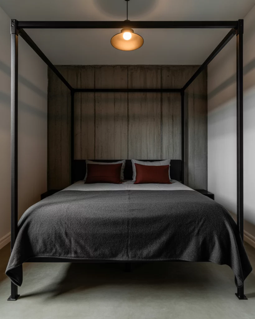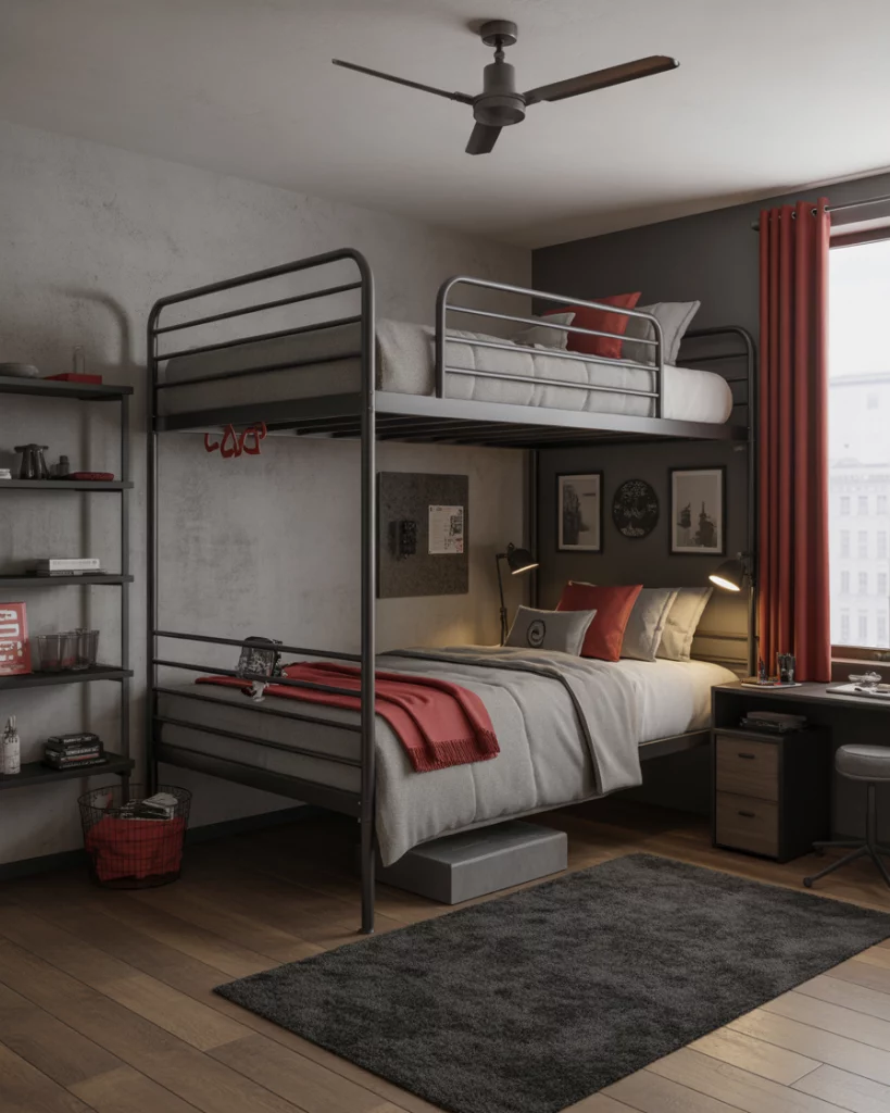 The men’s industrial dorm room balances raw elements like black metal bedframes, concrete textures, and exposed-bulb lamps with cozy details—like throw blankets and leather pillows. Keep to black/ gray colors and tinges of red or rust. This style is perfect for guys who want something mature, rugged, but still inviting.