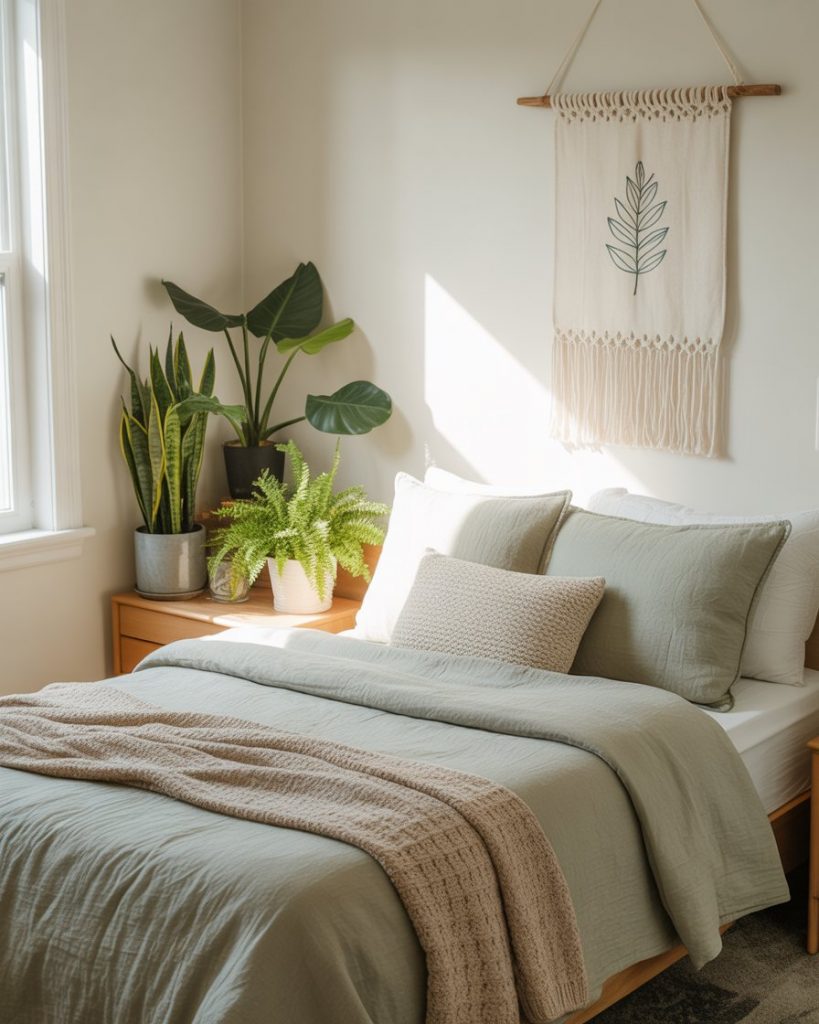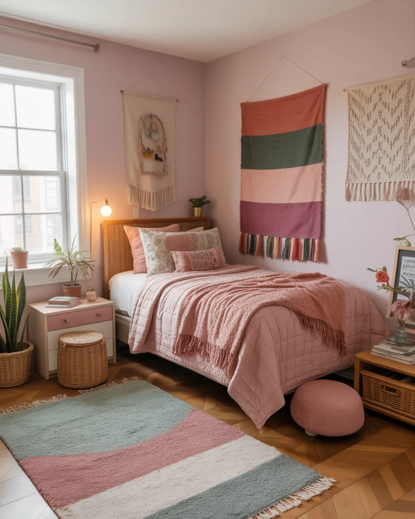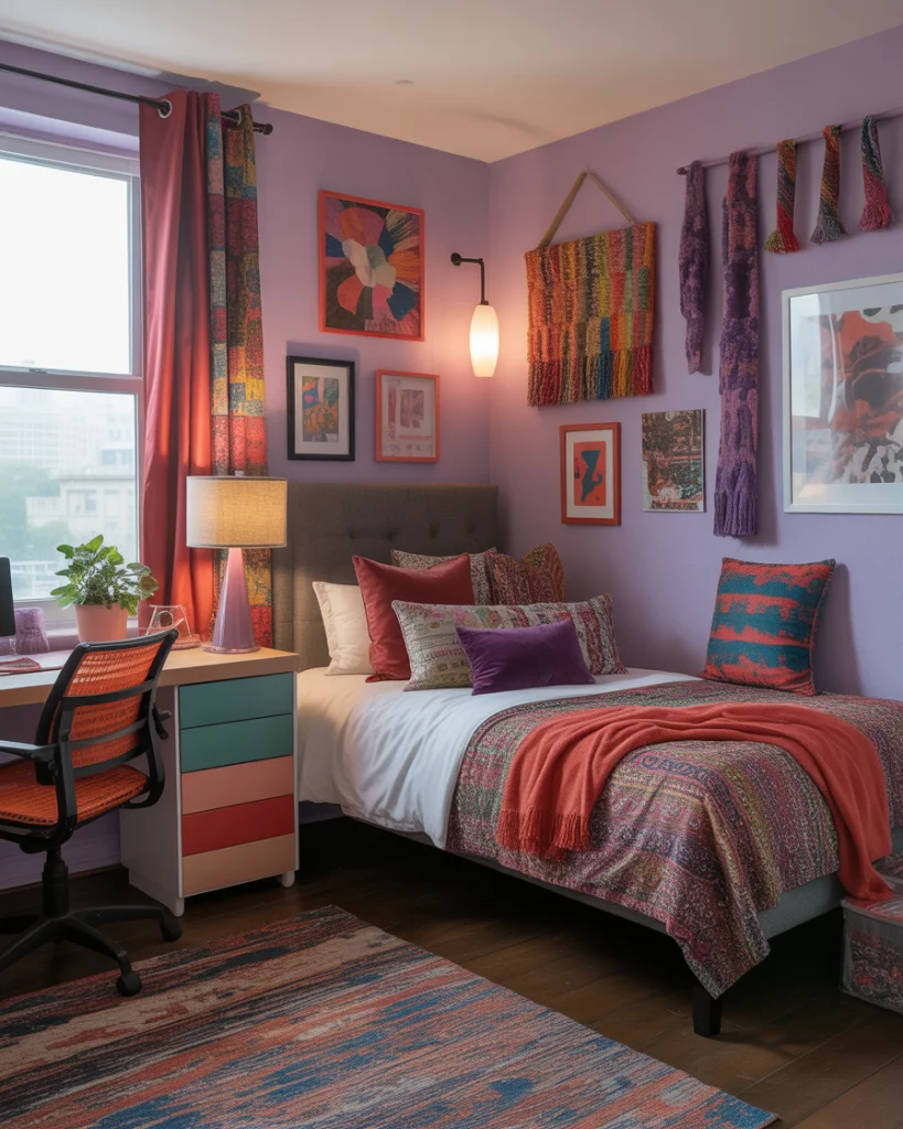 Boho style celebrates individuality and freedom. Think macramé wall hangings, layered rugs, and mismatched pillows. Take into consideration color schemes such as purple, green or pink in order to form a cosy place that is aligned to your character. This is amazing in shared dorms where mixing up is essential. Style blogger Emily Henderson often shares easy ways to bring boho into small spaces.