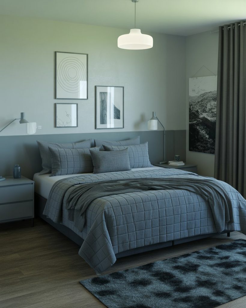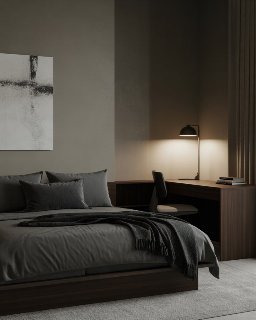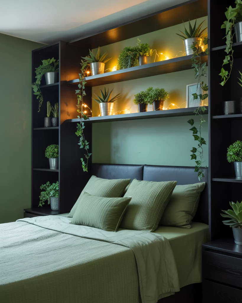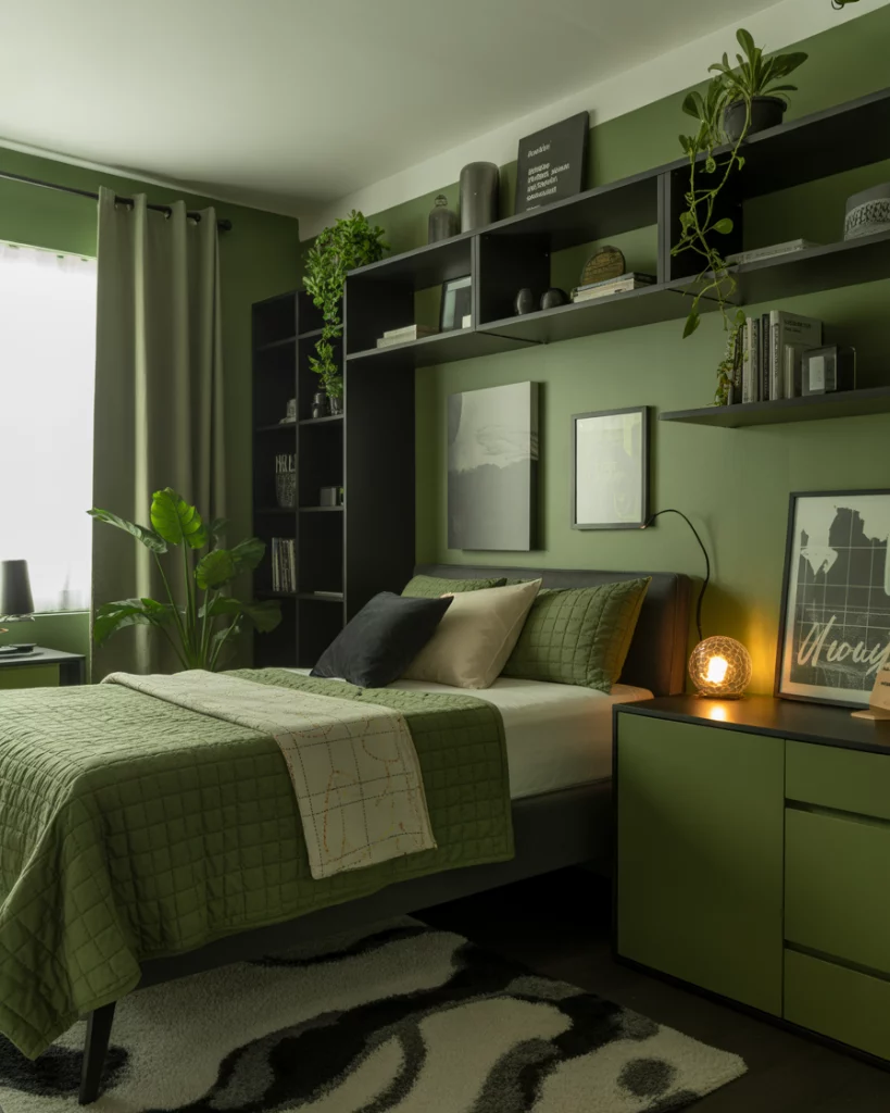 For a mix of earthy and edgy, combine color schemes green with matte black details. High-contrast black furniture or light with a green bed or light trimmings. It is great in a space that desires a nature infused room having a natural spine. Think zen garden meets urban jungle.