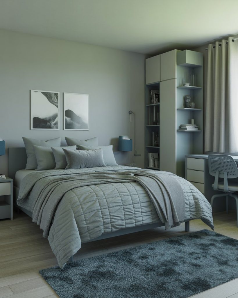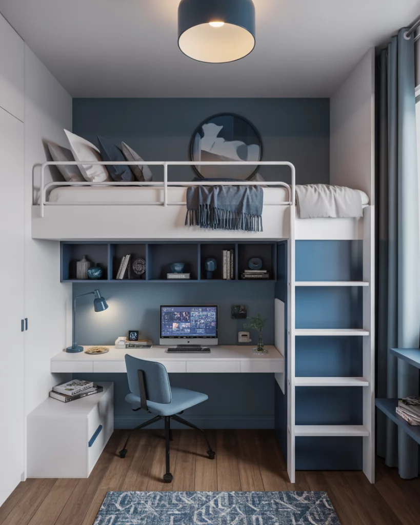 Pairing a lofted bed with a floating desk underneath creates the ultimate college multitasking zone. Save space while keeping things sleek. Choose such color combinations as soft blue and white to create a modern and de-cluttered environment. This design suits students with lots of study hours and minimal floor space.