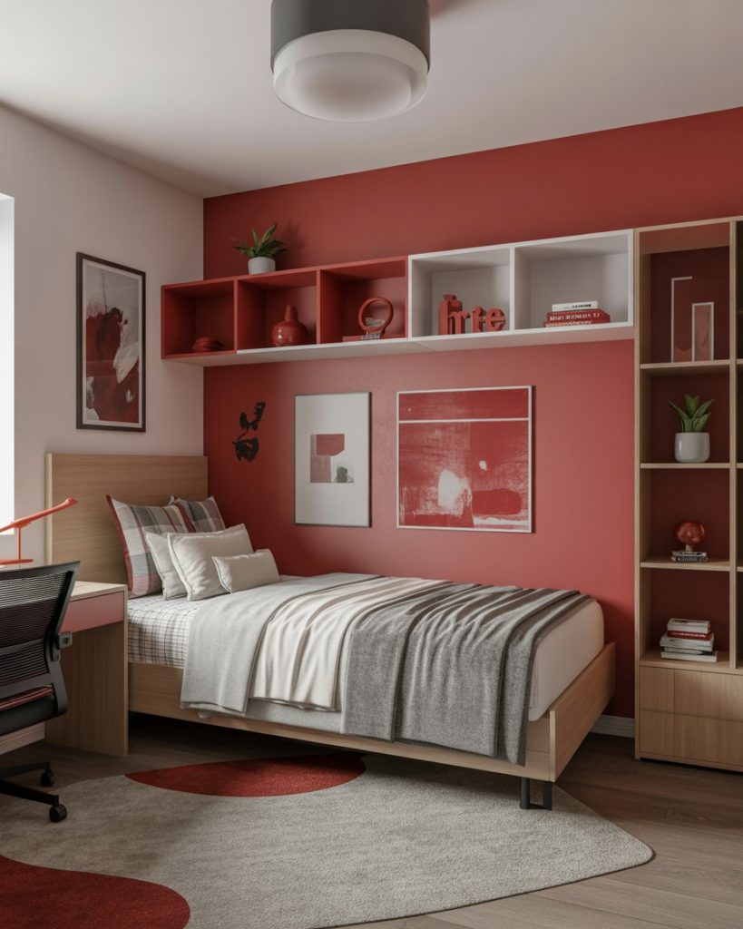 A single red accent wall can completely transform a dorm room without overwhelming it. Put up peel-and-stick wallpaper or fabric panels to accentuate a wall you use behind and/or around the bed or desk. Couple it with light neutral tones, wood pieces of furniture and metallic details to achieve balance. This modern design idea gives you energy without sacrificing cozy comfort—a great trick for those who want boldness in a small space.