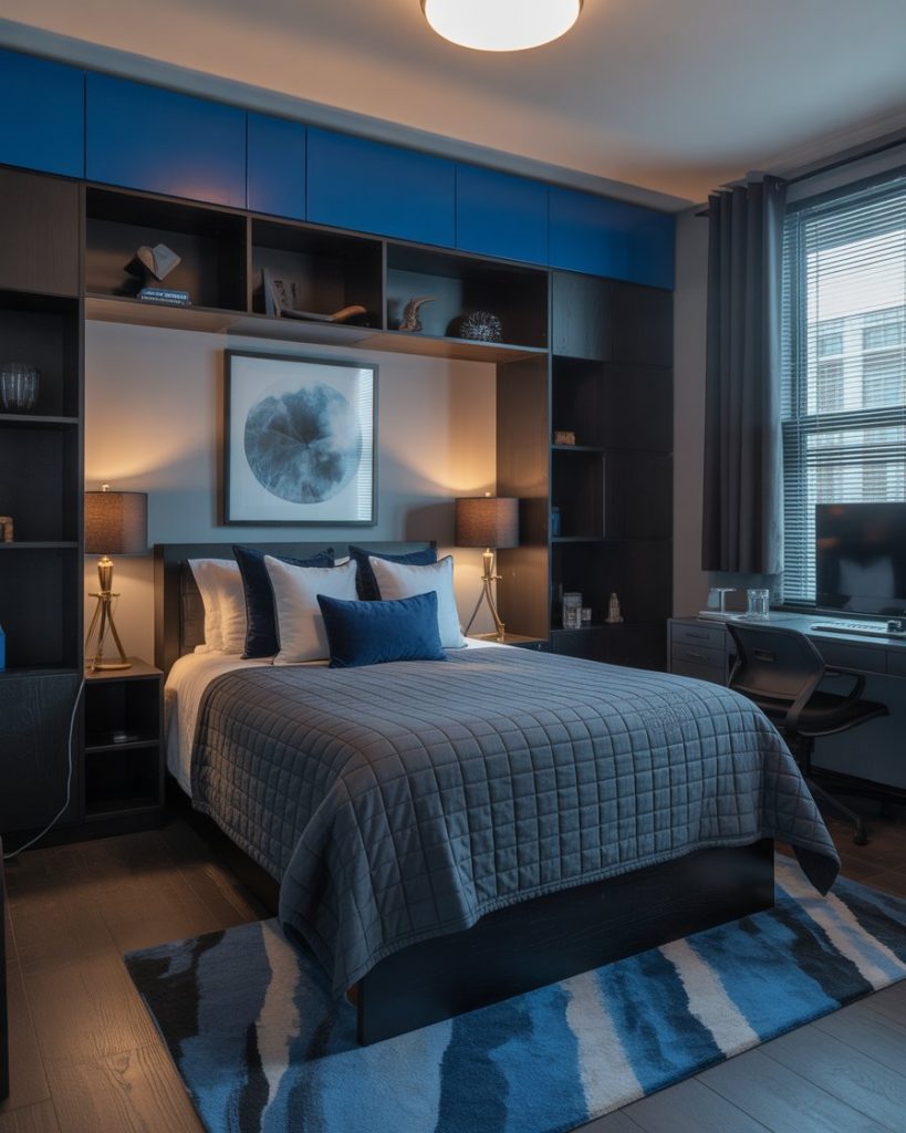 Combining color schemes blue and black adds instant sophistication to a dorm room. Black metal bed frames or shelving provides a solid base to black navy bedding. Add softening touches like by adding textured throws, warm lighting and subtle decor. This style is especially great for men or guys who want a cool, mature aesthetic that still feels cozy and functional.