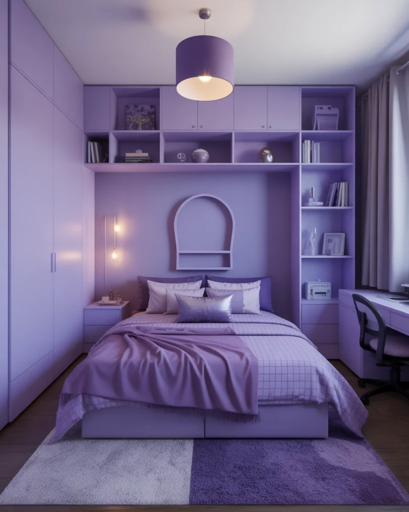 Purple is rarely a first pick, but it brings richness and personality to a dorm room. Lilac bedding or deep violet curtains with warm whitish shades and metallic colors provide an elegant style and warmth at the same time. This style is rather form-like and it is perfect in those situations when people need something unusual. It also complements color schemes cozy with a mature twist.
