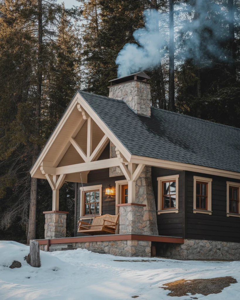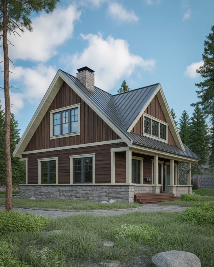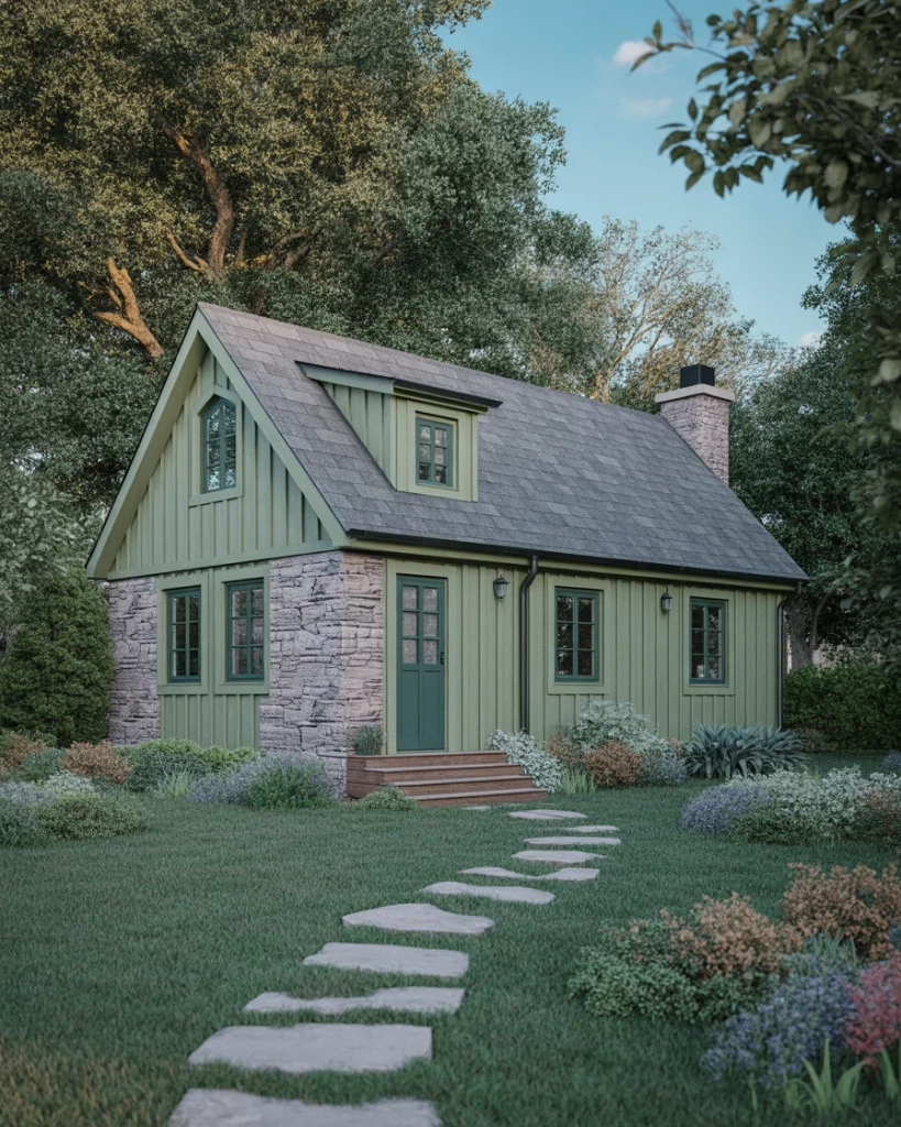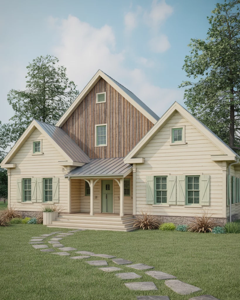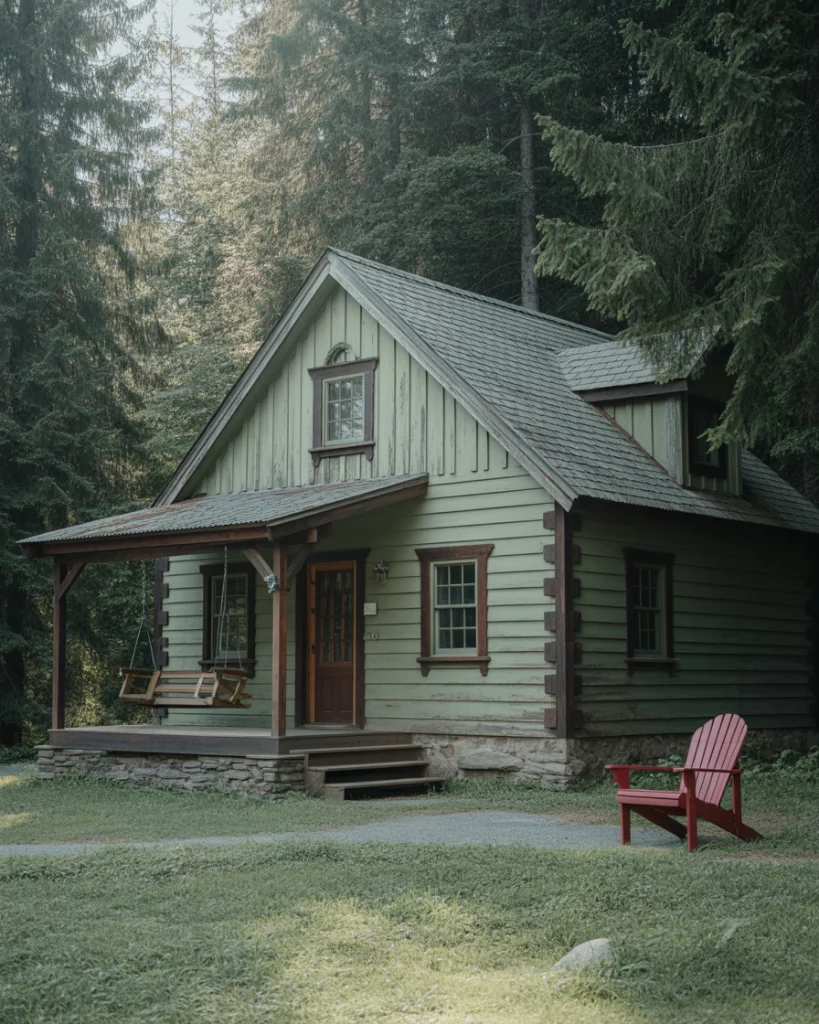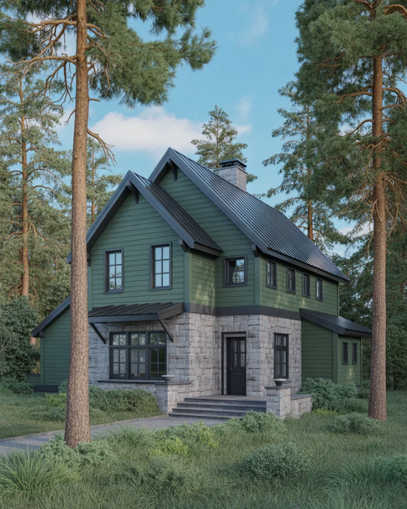 A mix of sage siding and natural wood accents creates an earthy, welcoming façade perfect for rustic cabins or suburban retreats. The combination is elegant with stone foundations or gravel driveways and fits right in well with green settings. Designers love its ability to look fresh in spring and warm in fall.