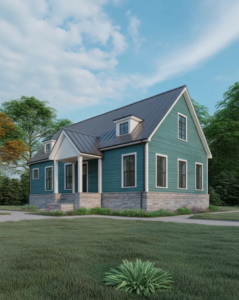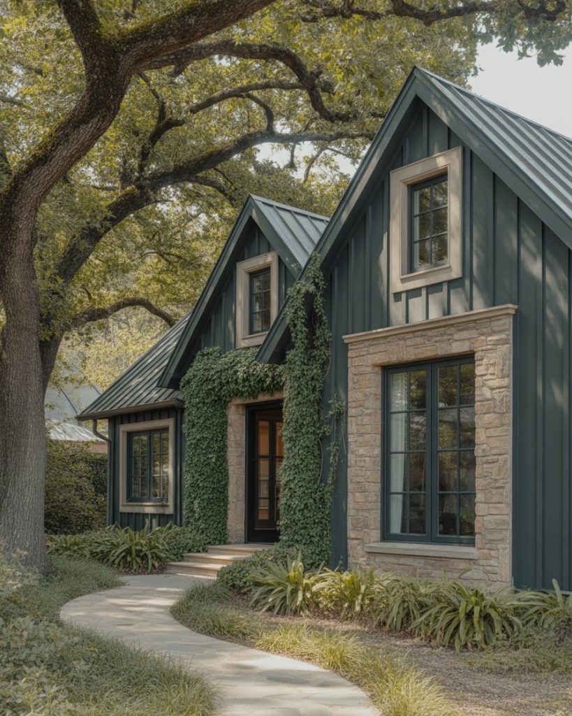 Blue green exteriors paired with stone façades create a sophisticated yet approachable modern look. This palette works perfectly with lakefront houses or contemporary farmhouses and will make one feel close to nature. It also pairs beautifully with white or light grey trim.