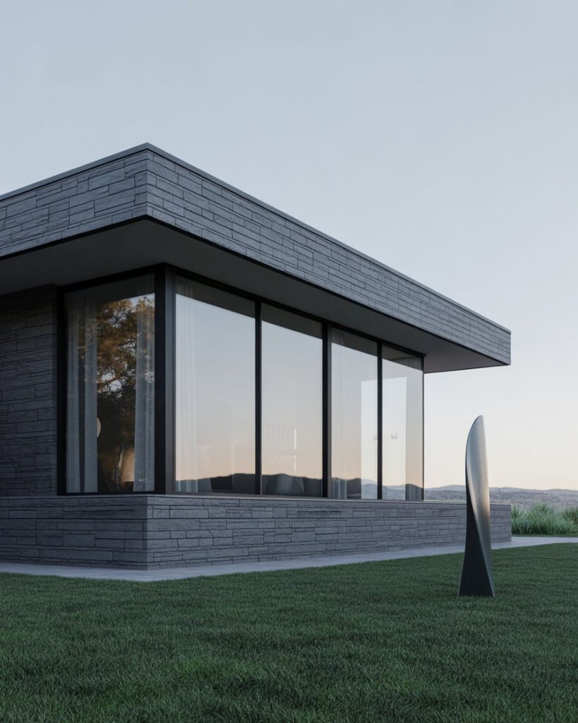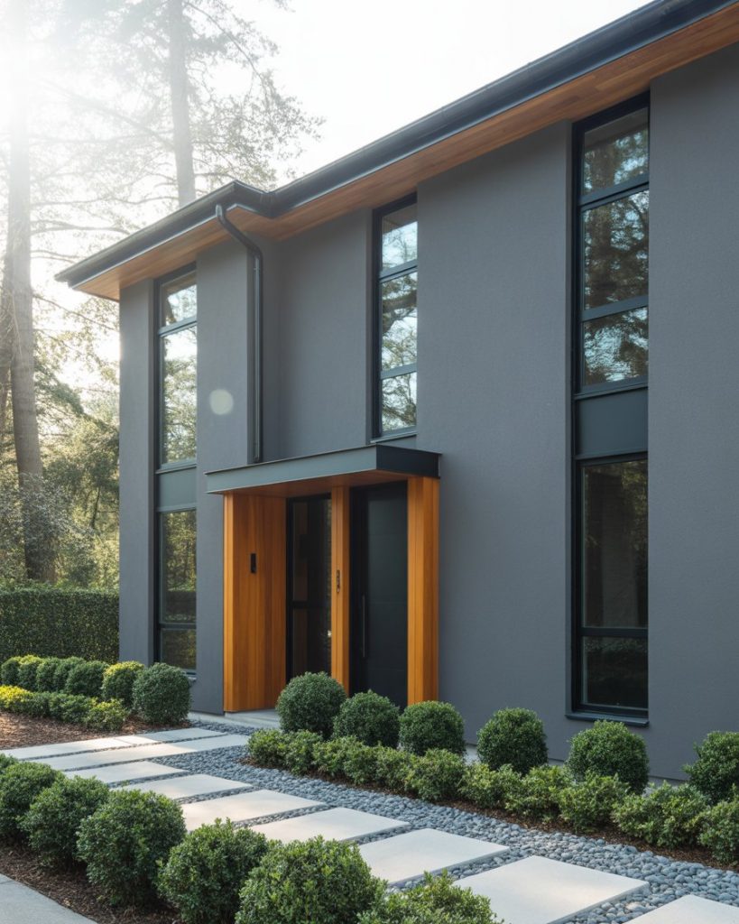A dark gray or dark grey exterior exudes strength and modernity. It can make a home a statement on design when it is paired with natural wood, or has windows that are black or even a touch of blue green on the front door. This aesthetic would complement both urban townhouses and modern constructions perfectly as well as revival mid-century builds. Experts at design sites like Houzz often note its ability to stay stylish through changing trends, making it a safe yet bold choice.