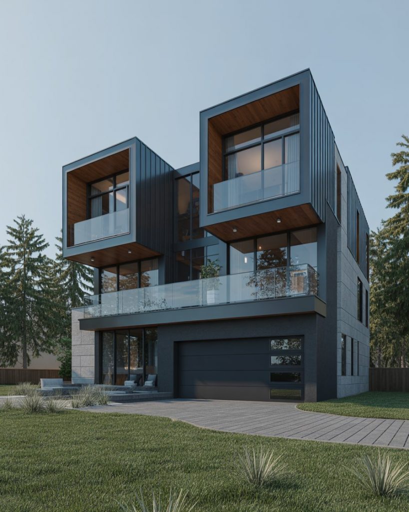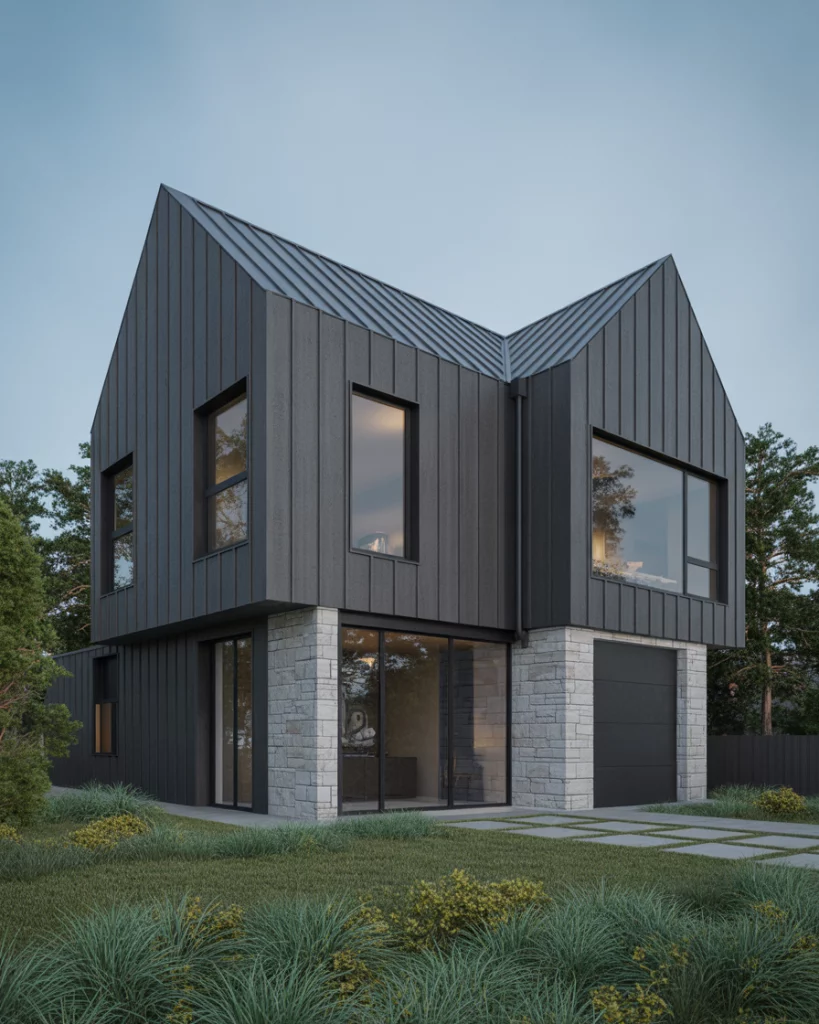 Combining dark grey, charcoal, and muted taupe tones creates a moody yet luxurious look. Such pallets would work well on upscale modern projects that feature black windows and steel or glass accents. It’s a designer-favorite for dramatic, upscale curb appeal.