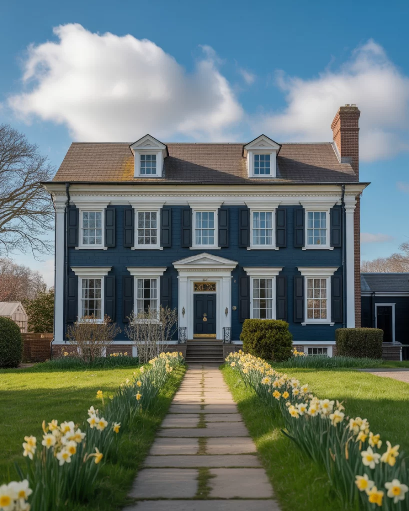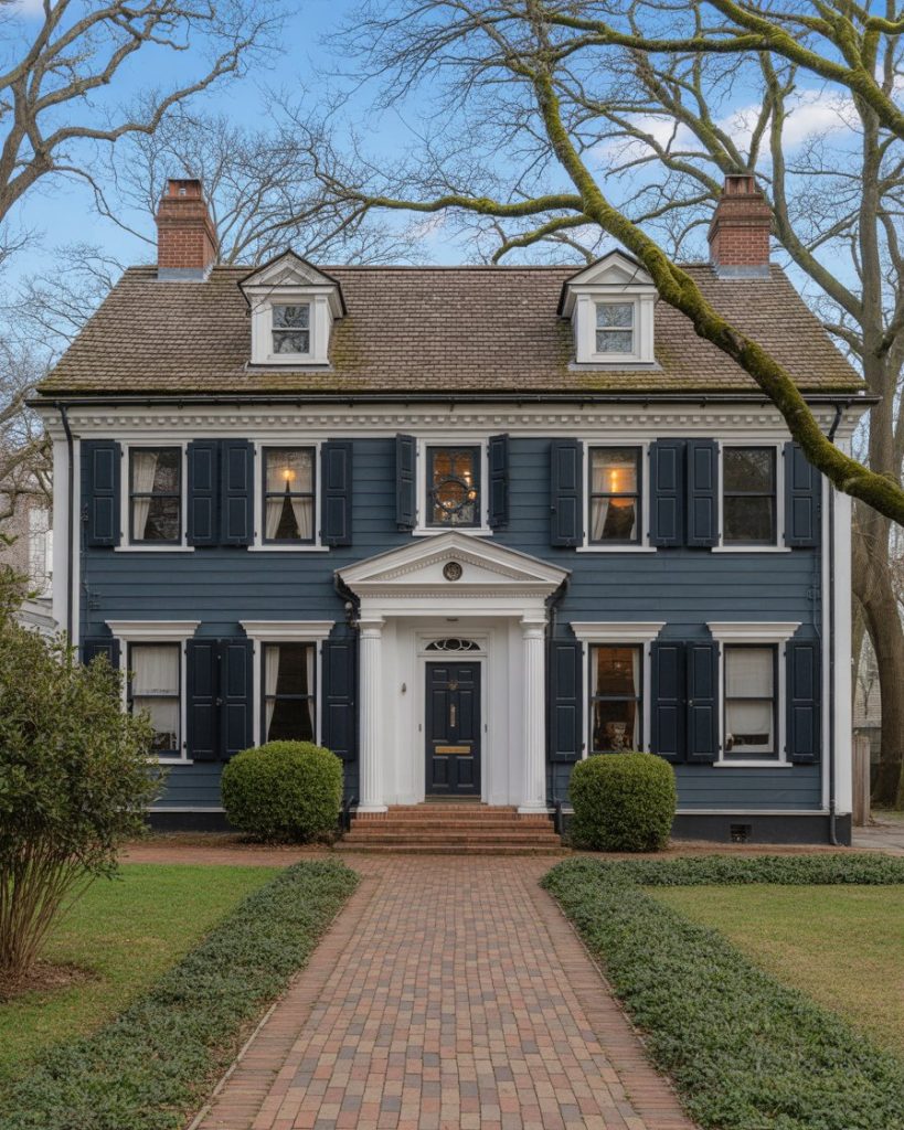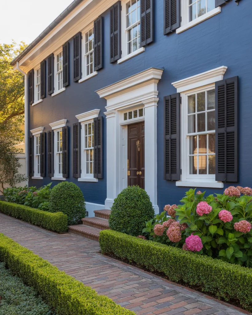 Navy blue exteriors exude sophistication, perfect for coastal estates or traditional colonials. This color looks timeless when paired with white shell casing or trim, or it can be given an ultramodern look when contrasted with brick pathways. Many Sherwin Williams shades in this range offer depth without overwhelming smaller homes.