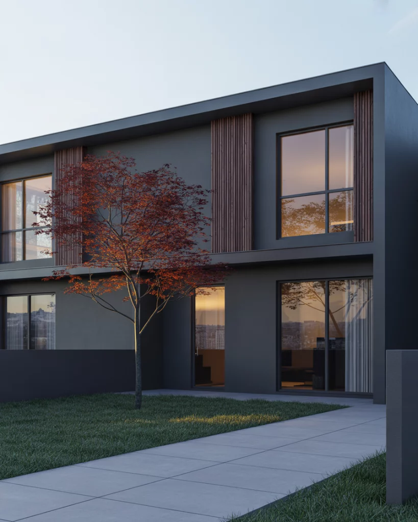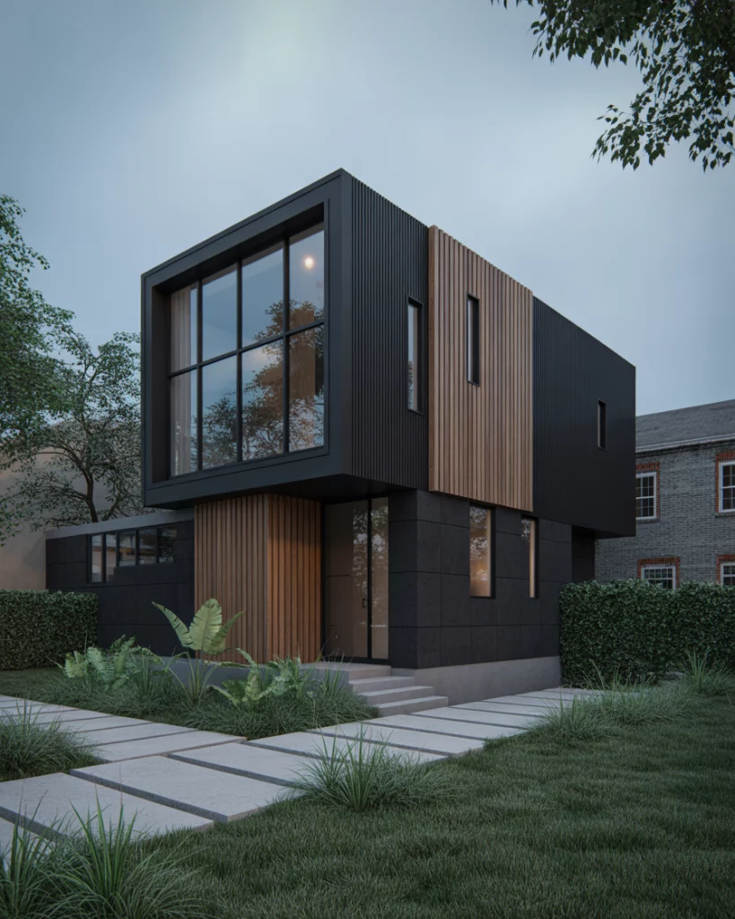 Using a dark base—whether deep brown, charcoal, or black—paired with warm wood cladding creates a striking modern exterior. It is a common appearance and has been observed in Australia architectural construction and city infill house. It balances industrial minimalism with organic warmth.