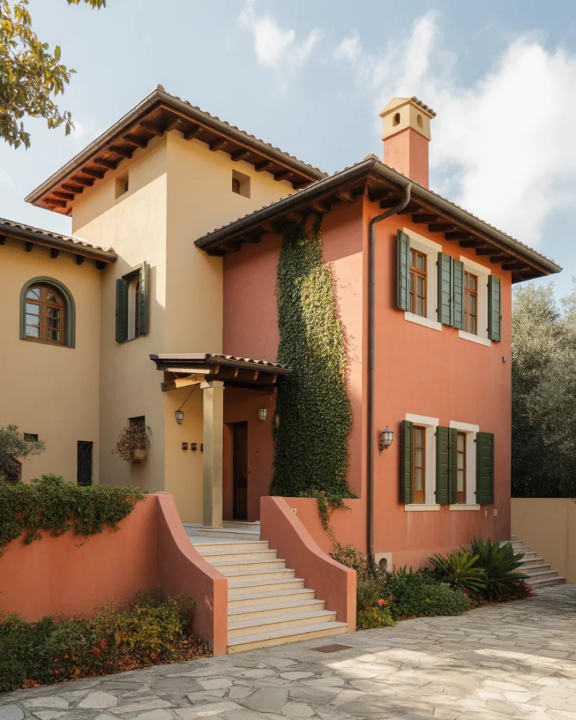 Dark green exteriors are making a strong return, offering a grounded, sophisticated feel that works well with brick or with stone. This blend looks gorgeous with Indian style Asian paints palettes creating bold but natural look. It would suit wooded areas as well as homes that are wanting a moody vintage feel. Envision some rustic cabin or an urban townhouse with black windows- lifted by the intensity of this color. Referencing Sherwin Williams’s Evergreen Fog, designers note its versatility across architectural styles.