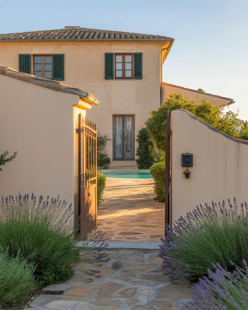 Cream siding accented by reclaimed wood details offers a charming, rustic look. This design is ideal combined with walkways utilizing stones or stucco wall, thus it is also more popular with the country estates. Designers often add muted sage shutters for a touch of color.