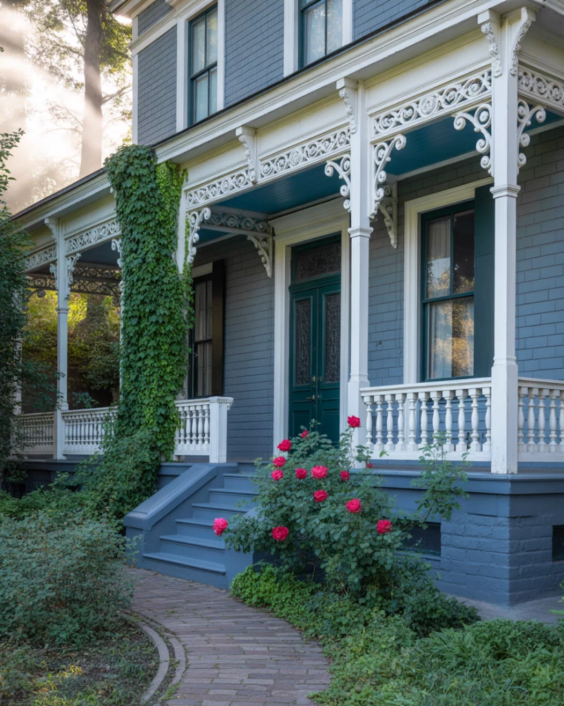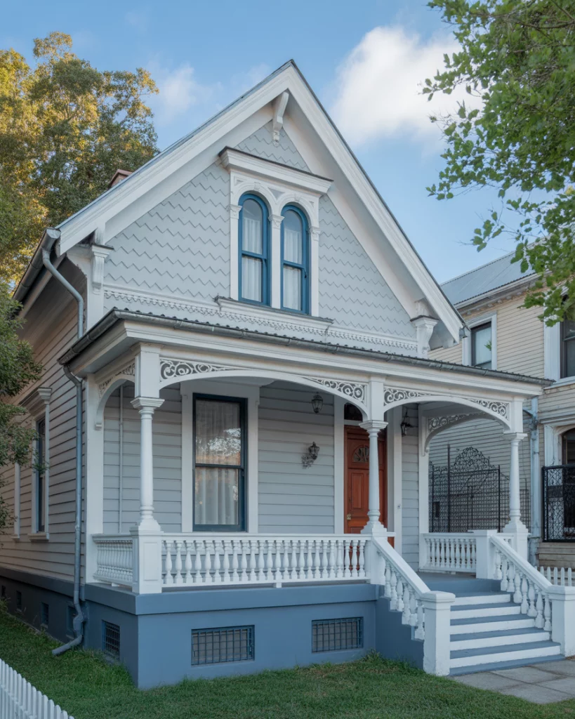 Blue grey paired with bright white trim creates a charming, timeless exterior. It also suits blockburg-style new construction as well as century-old Victorians. Many designers use this combination to highlight architectural details without overpowering them.