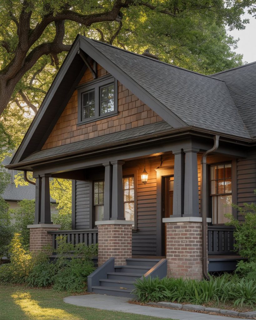 Dark brown siding paired with brick details gives a home historic charm and warmth. The appearance suits craftsman or colonial revival styles and has a comfortable moody style that weathers well. Sherwin Williams deep chocolate tones enhance the effect.
