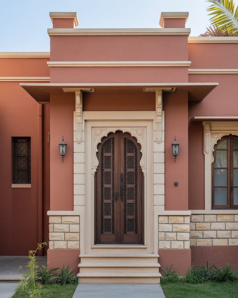 2025 trends Indian exteriors lean into earthy colors inspired by Indian style heritage—deep saffrons, muted reds, and sunbaked terracottas. It is a wonderful blend of these shades which Asian paints has, usually highlighted by stone or elaborately_panelled doors. The softness of such tones reaches the tradition of culture as well as breezy in the contemporary construction. Designers highlight that these hues age gracefully, making them a smart long-term choice for homeowners seeking both personality and durability.