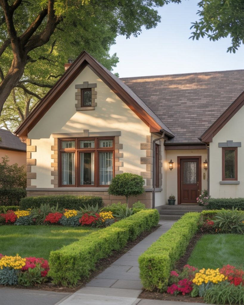 Cream and brown combinations remain a timeless pairing, offering warmth without feeling heavy. The cream diffuses the brooding richness of brown to produce a harmonising, friendly-looking front. The style goes perfectly well with stone, stucco or even wood accents and hence easily adaptable to a variety of architectural styles. It’s also a favorite among homeowners who want a color scheme that ages gracefully.