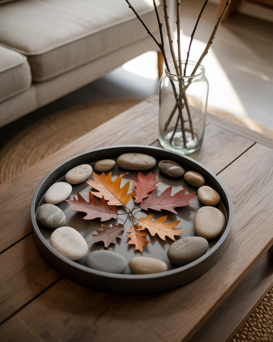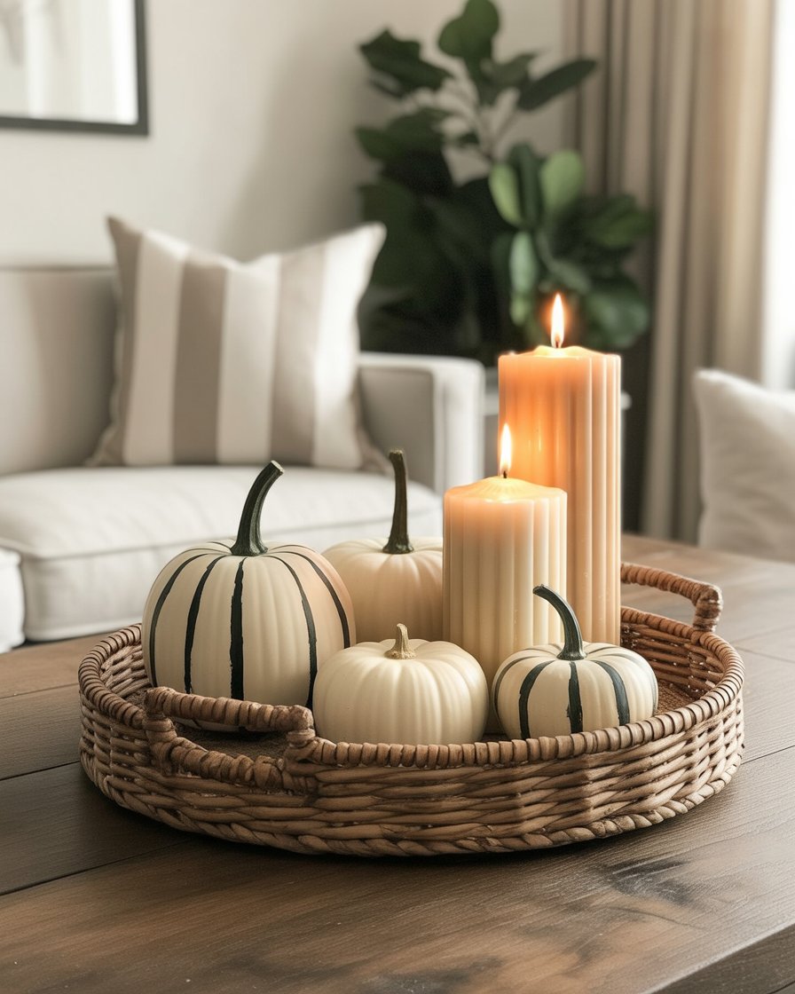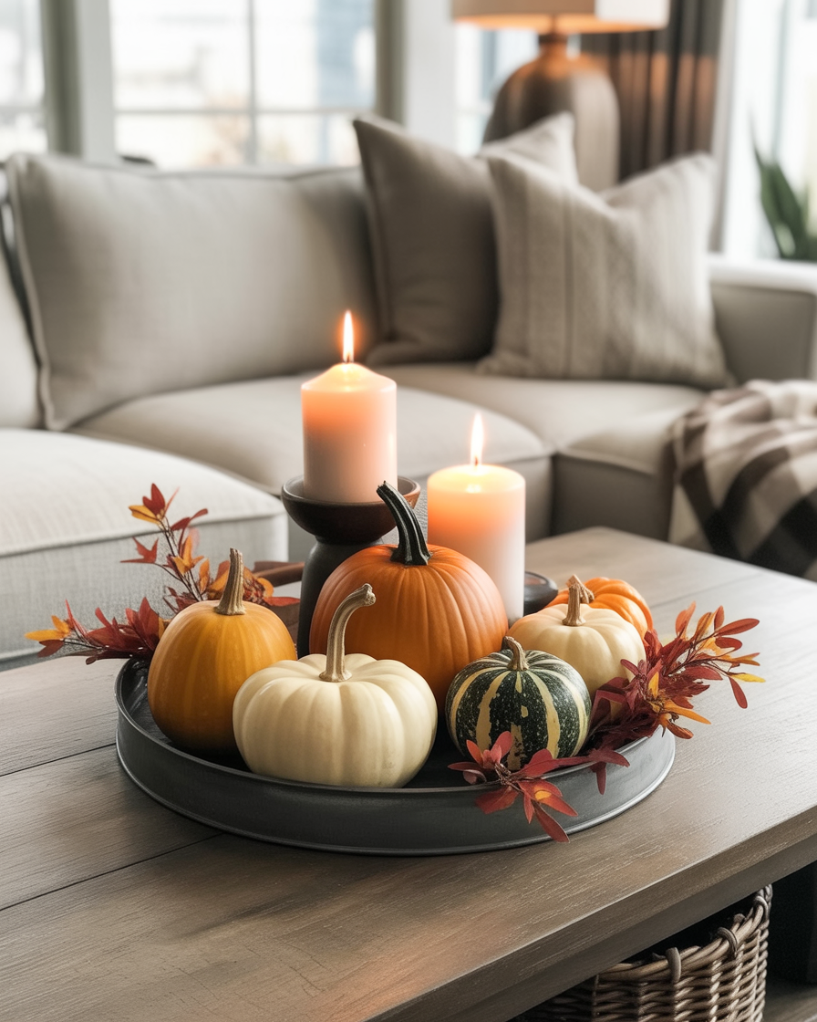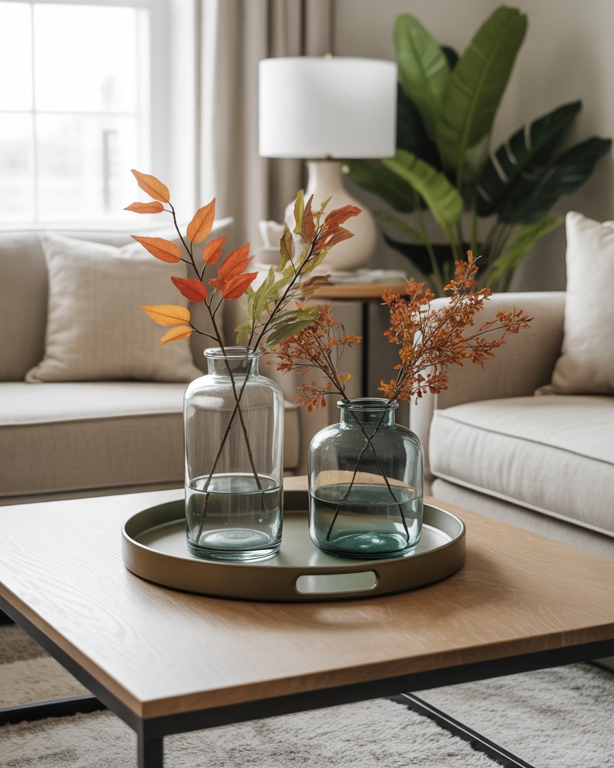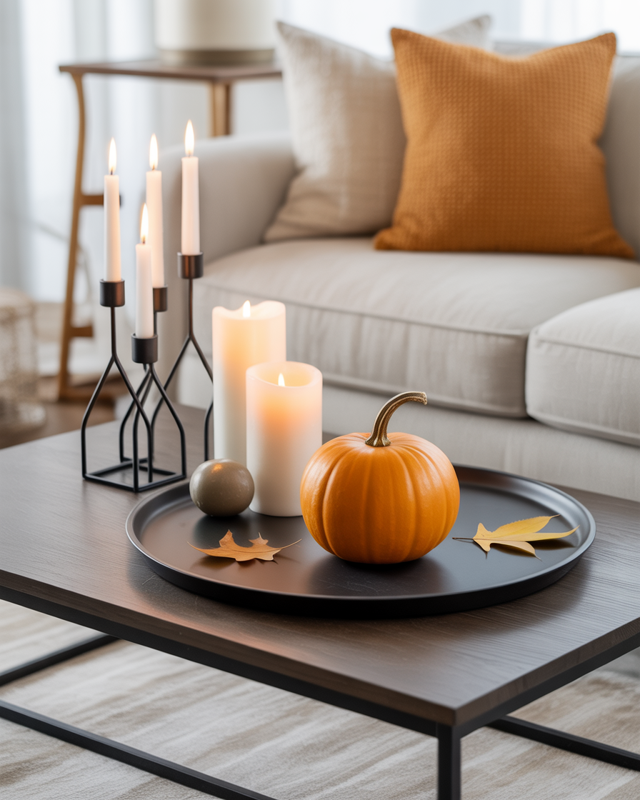 For those who prefer a more understated look, minimalist decor is the way to go. Choose a plain tray that has some fall accents such as one pumpkin, fall-sized leaves, or candles that are low. This style has more focus on the clean lines, so the table will not look too filler, but still will accomplish the beautiful and comfy fall atmosphere. Neutral colors and geometric shapes will keep the style simple yet effective, perfect for modern living rooms that lean toward minimalist design.