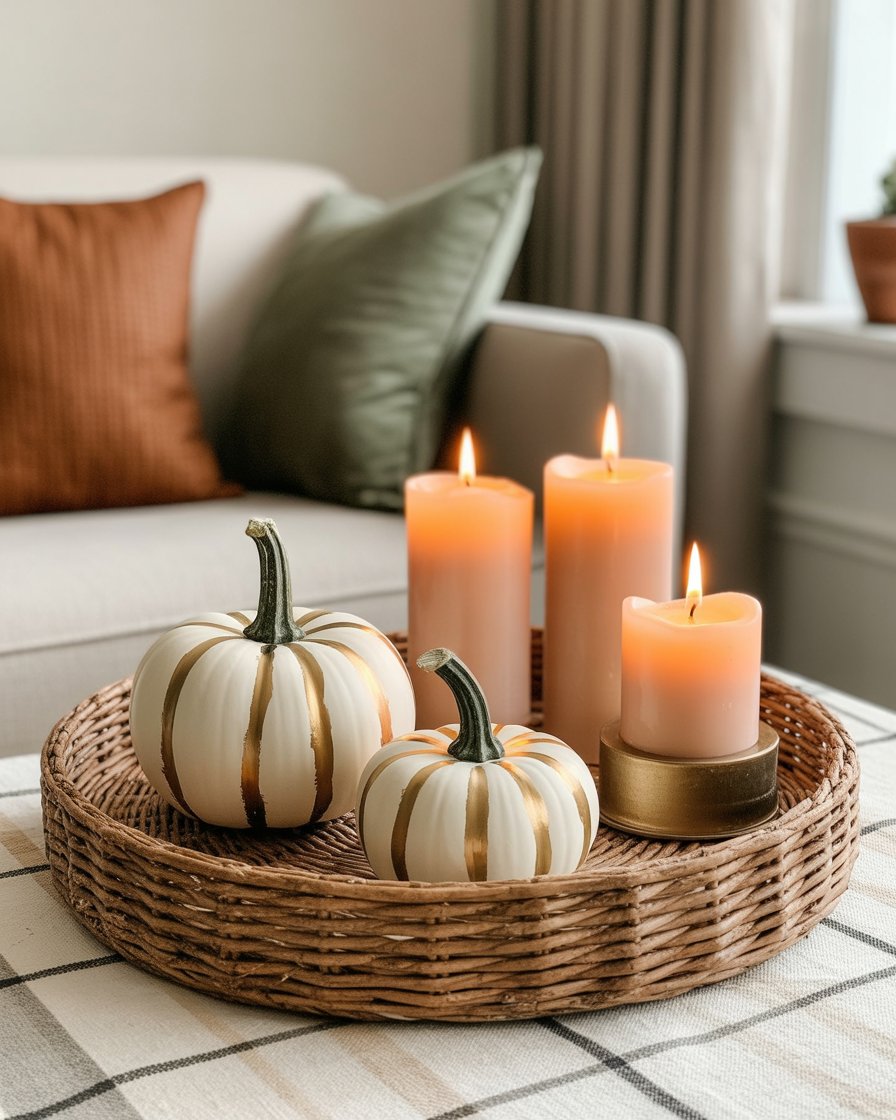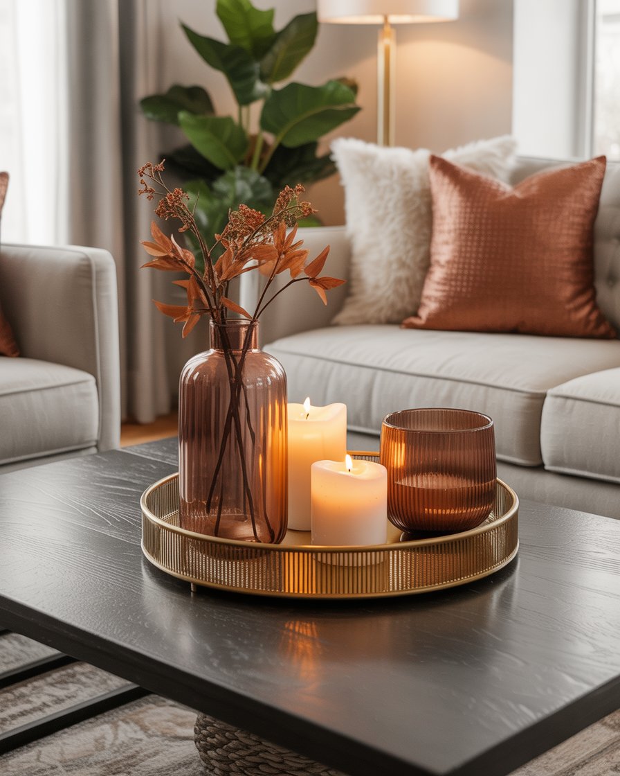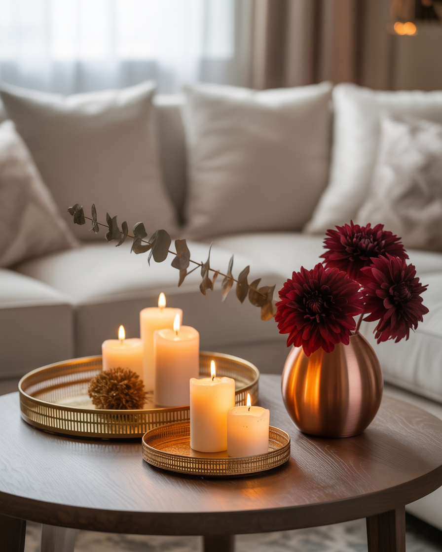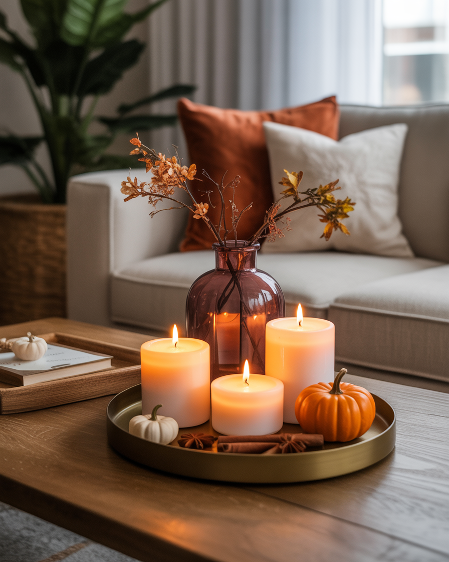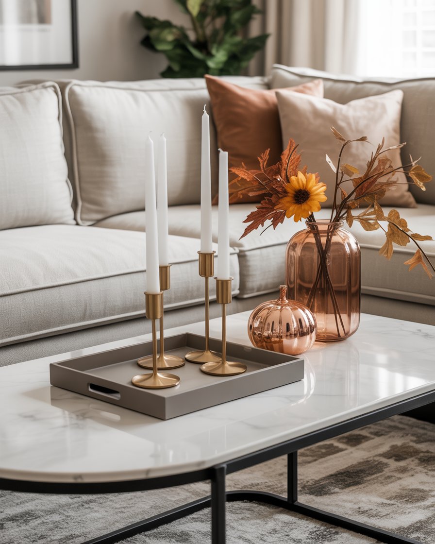 For those seeking a more elegant and modern approach, metallic touches are ideal. One can put a metallic tray with a gold candleholder, copper vase or silver details that can enhance your coffee table. These are excellent to pair with the neutral fall decor such as white pumpkins or candles of amber color to achieve the even balance, which is both stylish and warm. The metallic accents add sophistication and reflect the warm glow of candles, perfect for those who prefer a refined style.