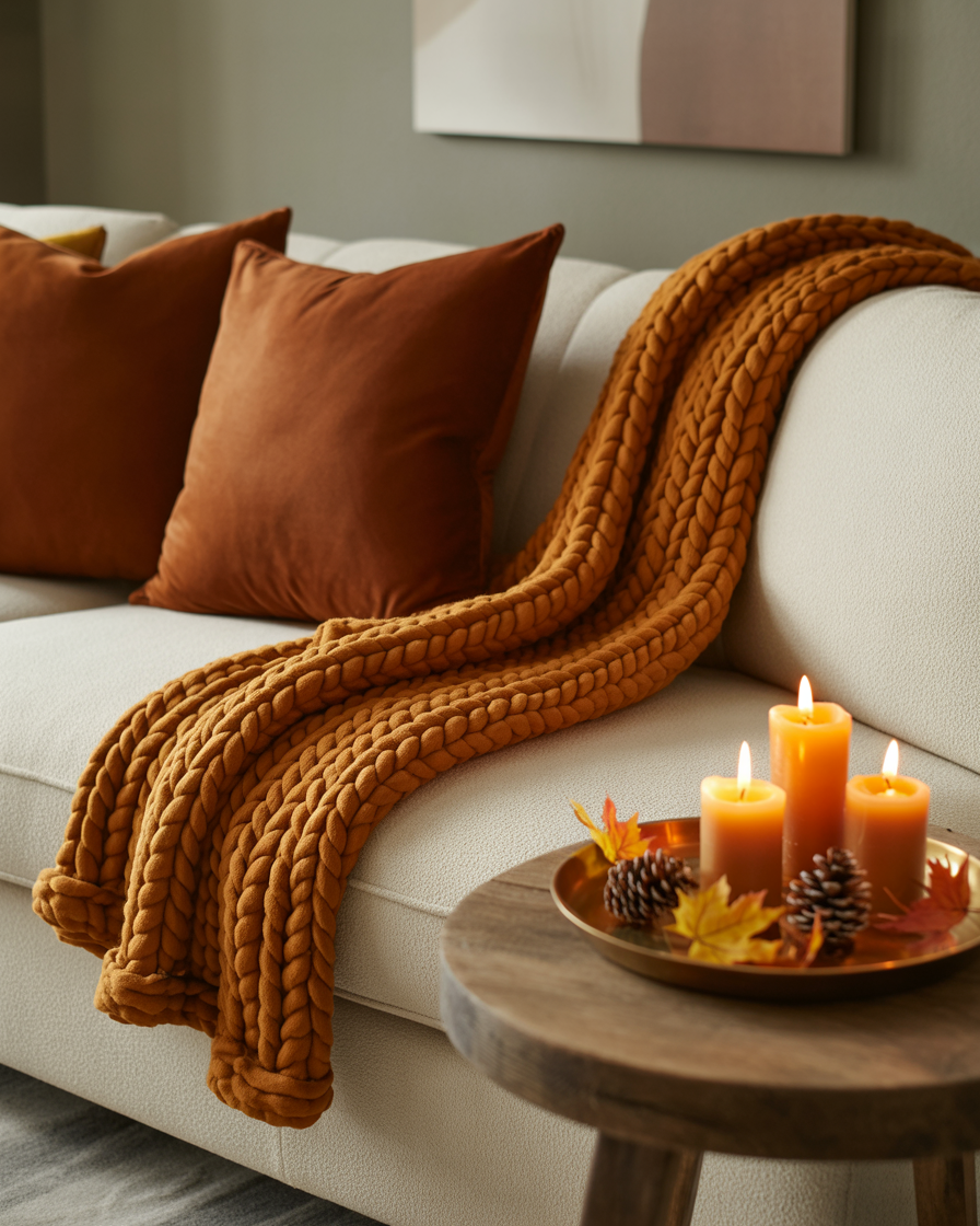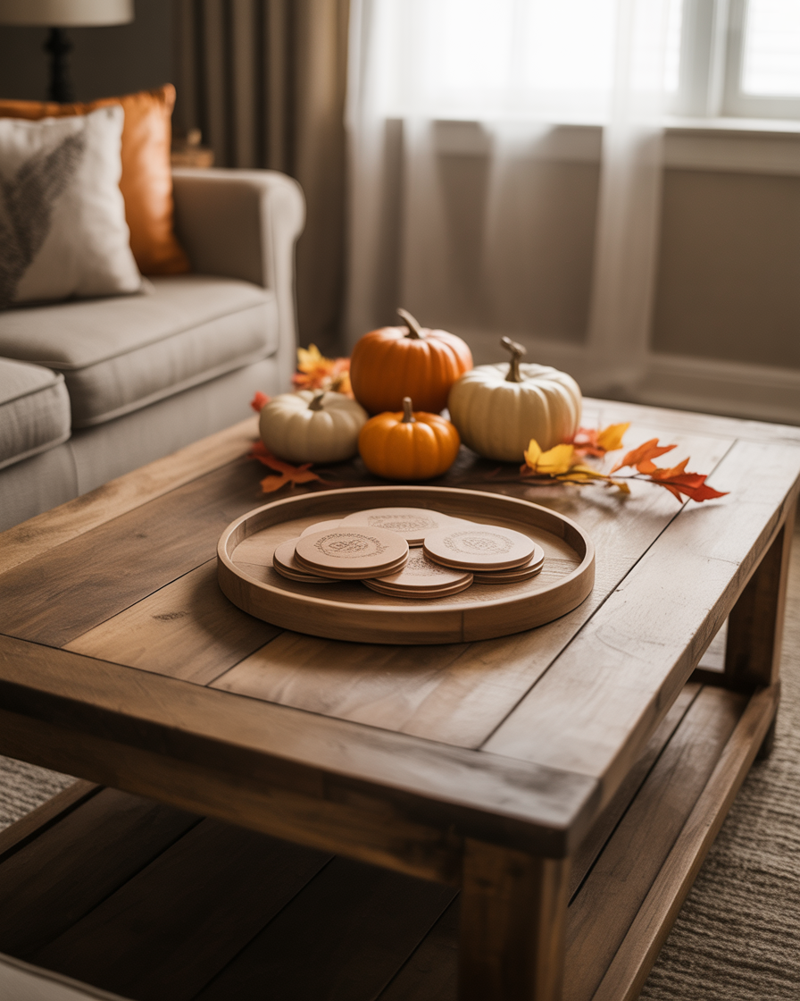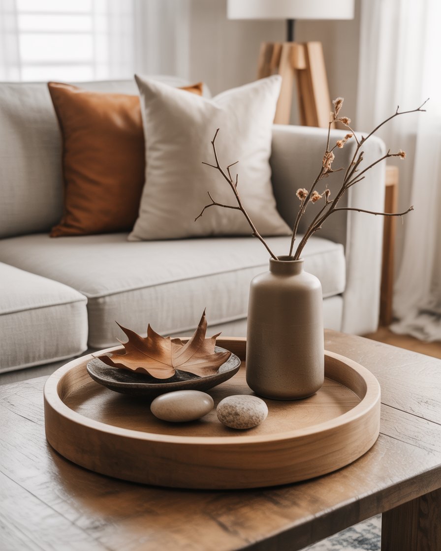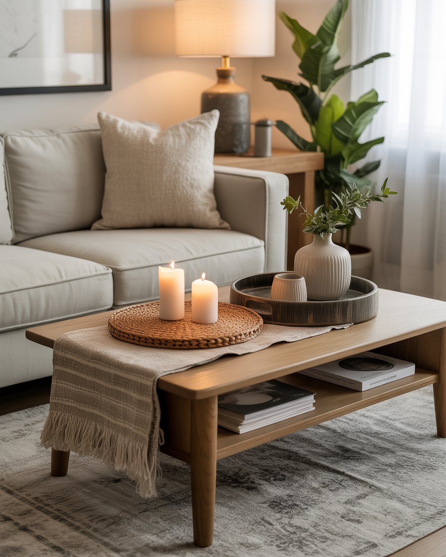 To create a more dynamic and textured coffee table look, layering textiles is a fantastic option. Put a small throw blanket on the sofa next to you or place an inexpensive placemat of woven fabric under your round tray. Remember to blend textures: a wool, a leather, or a cotton texture is nice to give multidimensional richness to the space. These cozy touches provide warmth without overcomplicating your decor, making your fall coffee table a stylish yet comfortable focal point.