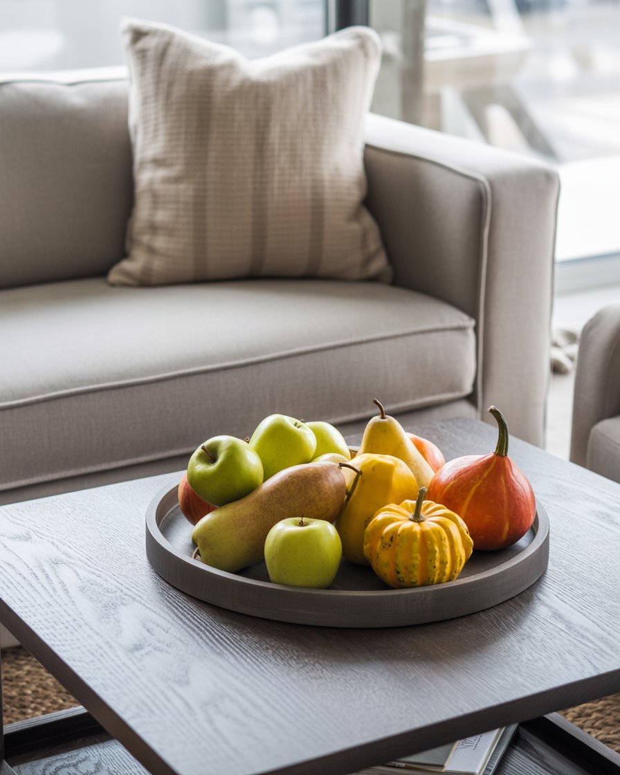 If you want to incorporate a more vibrant touch into your fall decor, autumnal fruits and gourds can make a stunning centerpiece. The happy yet stylish mood will be with the help of a round tray or any kind of rectangle tray with apples, pears and colorful gourds. These new objects provide your coffee table with a new fresh, seasonal appearance and are simple to change with every new month. Pair them with simple neutral items like candles to keep the overall tone cozy and balanced.