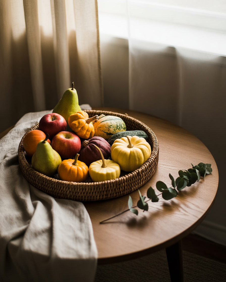 16. Autumnal Fruits and Gourds for a Natural Centerpiece