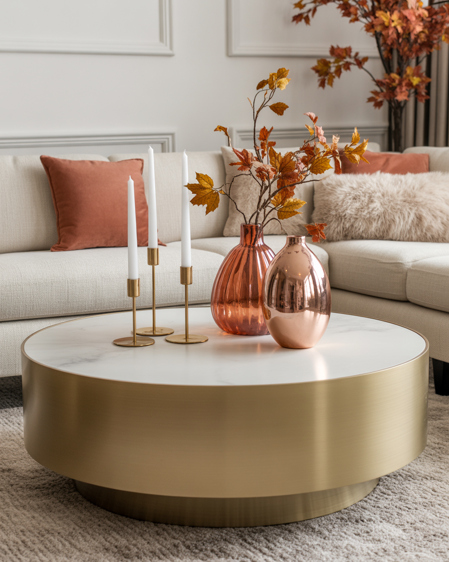 For a touch of sophistication, incorporate metallic accents into your fall decor. Choose gold, silver or copper to make a refined contrast to natural fall textures. It is just enough to use metallic objects such as trays, vases or candleholder to form your coffee table and make it appear elegant and stylish. These subtle metallic tones work well in living rooms cozy spaces, as they reflect the warm glow of candles and enhance the autumnal colors of the season.