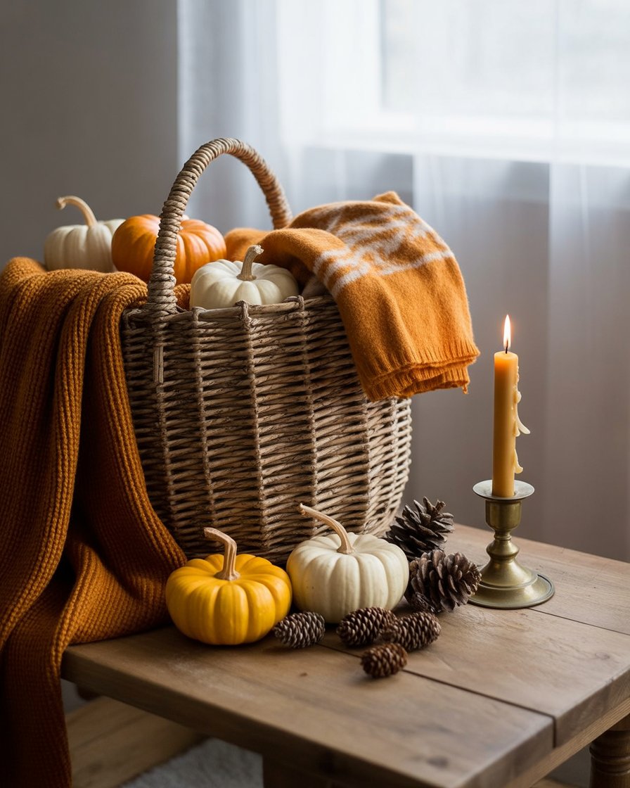 A charming addition to any fall coffee table is a woven basket filled with seasonal textiles and fall decor elements. You can put in the basket small throws, warm scarves, fall items as pinecones, little pumpkins, and dried flowers. The entire arrangement looks organised by keeping the basket on a tray. The neutral tones of the textiles paired with the natural fall items bring a warm and welcoming vibe to your living room, making it perfect for cozy autumn nights.