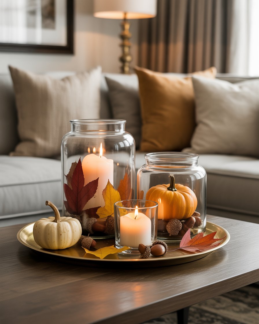 For a more refined and sophisticated fall coffee table, incorporate elegant glassware filled with seasonal elements. Fall-themed pieces such as colorful leaves or little pumpkins or acorns can be slowly poured into a glass jar or tall vase. Place some few candles there around the glassware to make it glow and warm. Place these elements on a simple tray to keep everything neatly organized while showcasing a delicate and elegant fall aesthetic that will elevate your living rooms cozy atmosphere.