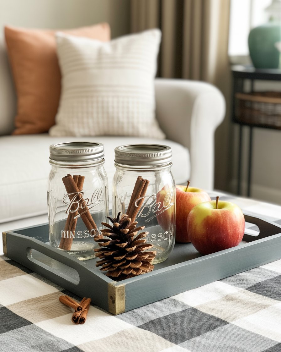 Why not repurpose everyday items to bring a little fall charm to your living room? Cinnamon sticks or mini pinecones in Mason jars have made a great DIY centerpiece with even little fall fruits such as apples. These items can be sorted either on a round or a rectangle tray easily to get a fresh fall appearance. It’s an easy and affordable way to elevate your coffee table decor, adding personal touches without going overboard.