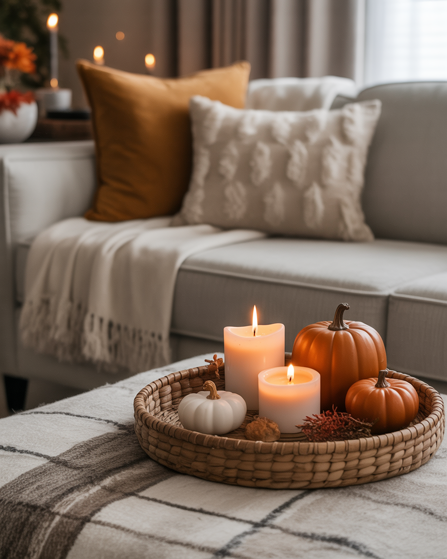 Transform your living rooms cozy vibe by adding some soft, textured accents to your coffee table. Although a tray might be a practical surface, lovely hand-woven coverlet or some comfy throw pillows at hand can present your area homey. Such neutral accents would help offset the more vivid fall colors and be comforting and warm. Incorporating a tray with candles and a soft, knitted throw will complete the look for those chilly evenings.