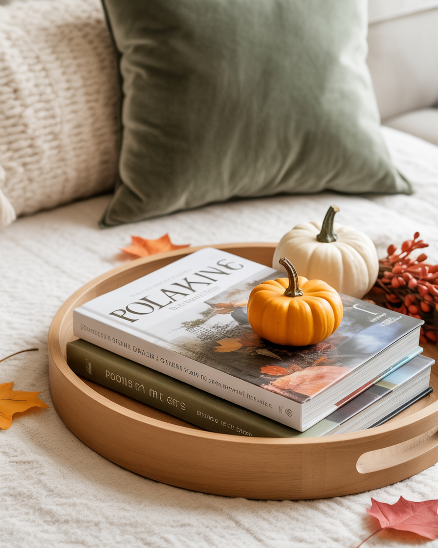 For those who enjoy the cozy vibe of curling up with a good book, consider incorporating fall-themed books into your decor. Place some autumnal novels that you like or decor magazines on a tray that is in a living room. Then, put some fall items on top, even little pumpkins or other fake leaves, to make the fall season come to the comfortable atmosphere of your living rooms. This is a great way to add character to your tray while showcasing your personal style.