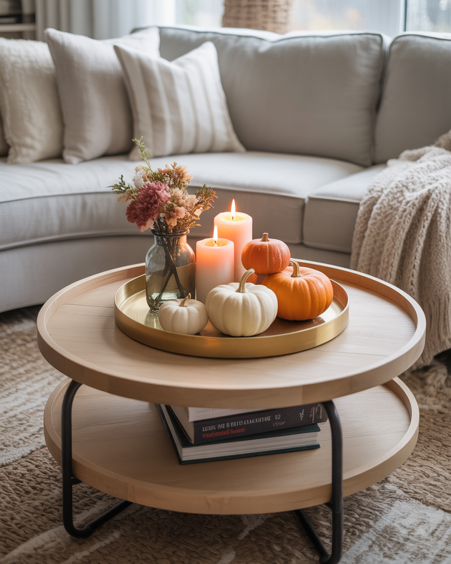 Tray layering is a simple way to add dimension to your coffee table. Put a round tray at the bottom and place smaller trays over it full of candles, books and the little objects like pumpkins or acorns that are the trappings of that season. The layering method will make your living room look structured but also eclectic, which will suit the autumn season the most. You can easily adjust the arrangement to suit your modern farmhouse or elegant style, adding personal touches with family heirlooms or DIY pieces.