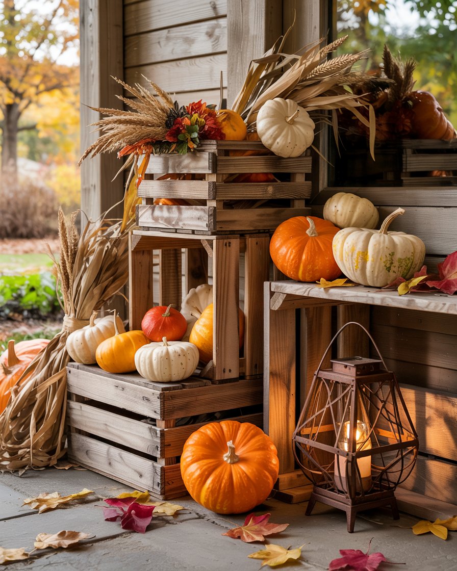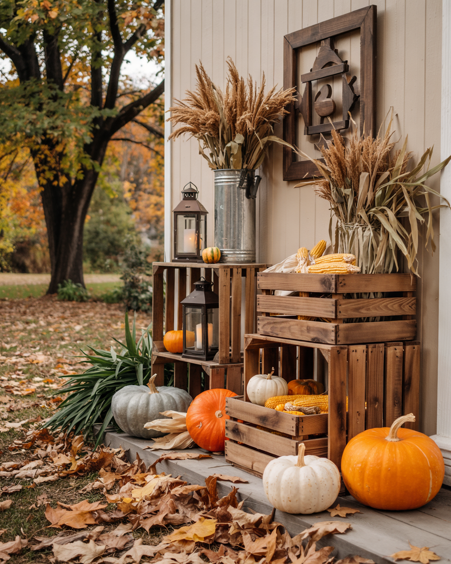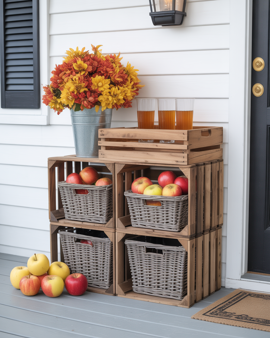 Nothing says fall like layered crates filled with seasonal produce. Pile wooden boxes or wall shelves close to the door, and put mini pumpkins, dried corn, and lanterns into them. It’s a great way to turn your porch into a mini harvest display that feels both inviting and vintage. The arrangement is a modular seasonal fixer-the merely replace the contents. It’s one of those ideas space saving diy storage hacks that also brings a nostalgic farm-market vibe to your entry.