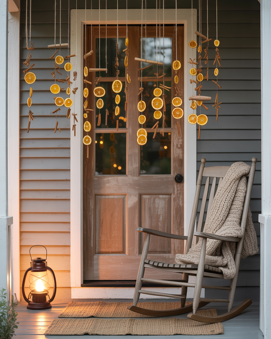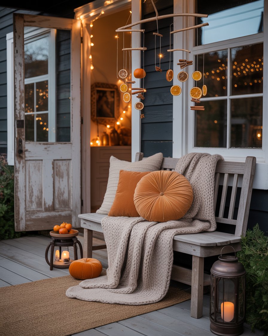 Create aromatic fall mobiles using dried orange slices, cinnamon sticks, and bay leaves. Dry and hang them over the porch beams or the entrance to bring a natural and smell sweet effect. This is one of those diy concepts that are pretty and cost effective. The mobile is a decoration of the season and it gently greets visitors by its smell. It’s a cozy little project that makes your space feel personalized and thoughtful.