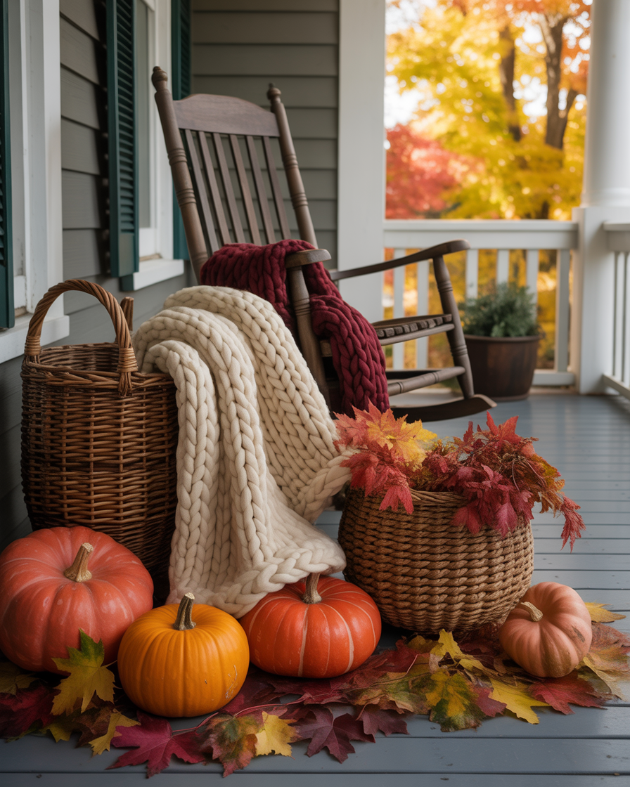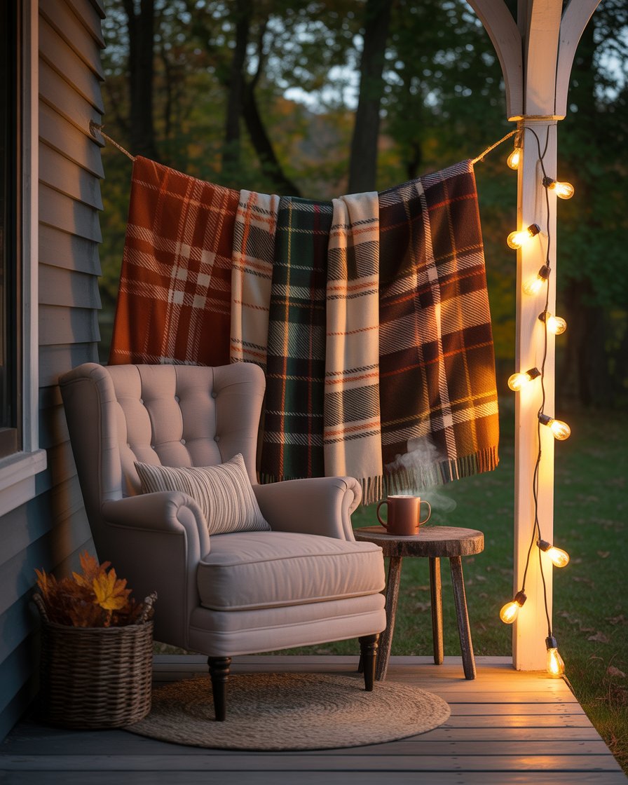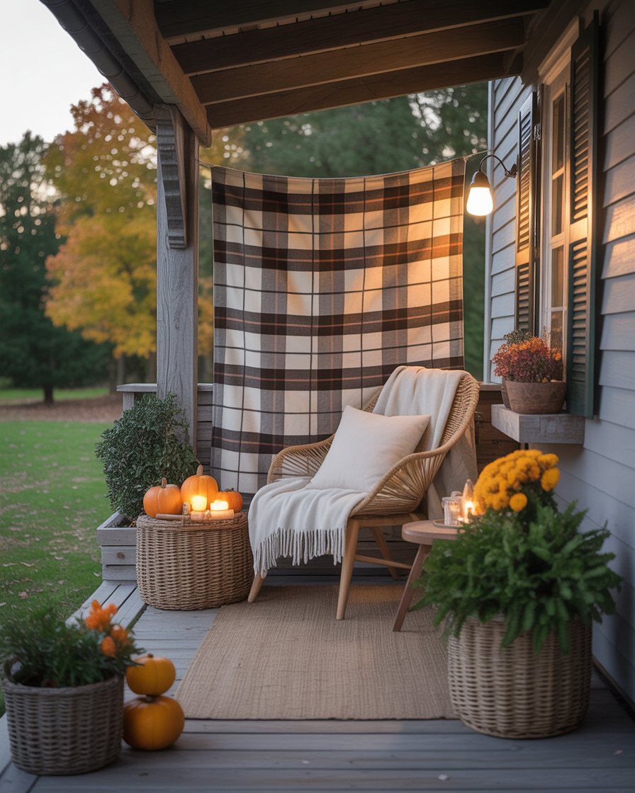 Transform your porch into a cozy room by hanging thick fall blankets on a rod or rope divider. This brings privacy as well as texture and color to the area. It is ideal in townhouses, or restricted porches because you cannot construct walls to have some confidentiality. Add a chair and some candles, and it becomes your seasonal retreat.