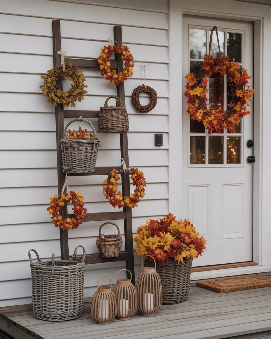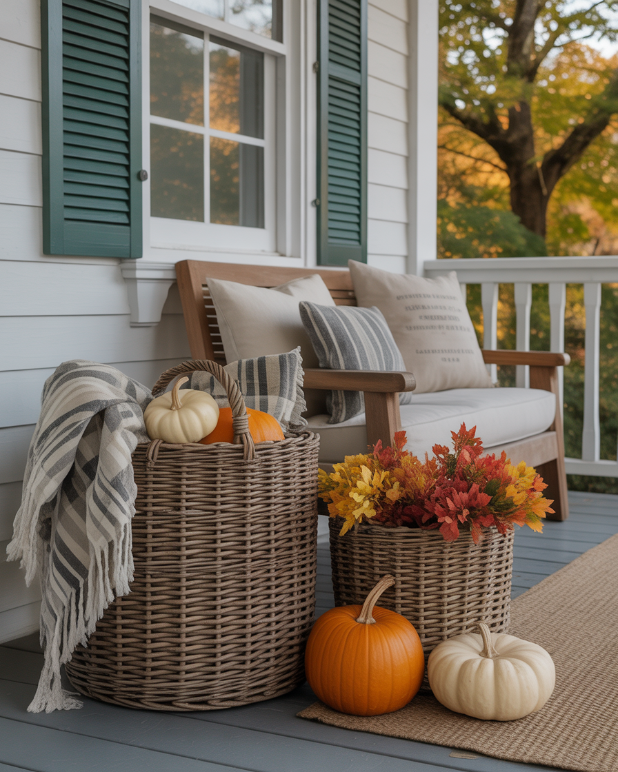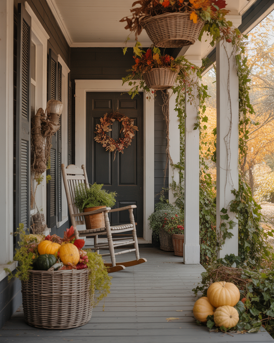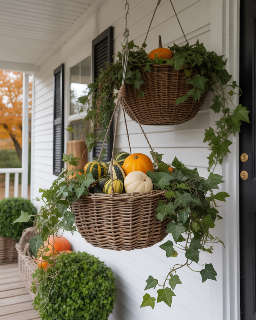Instead of using traditional planters, hang woven baskets from porch hooks and fill them with gourds, ivy, and faux vines. It is one of the more imaginative little things to do diy and add flare vertically. The style is best suited on small porches where you require space saving ideas that will not consume floor spaces. Plus, it brings movement and texture to your setup—almost like your porch is wearing fall jewelry.