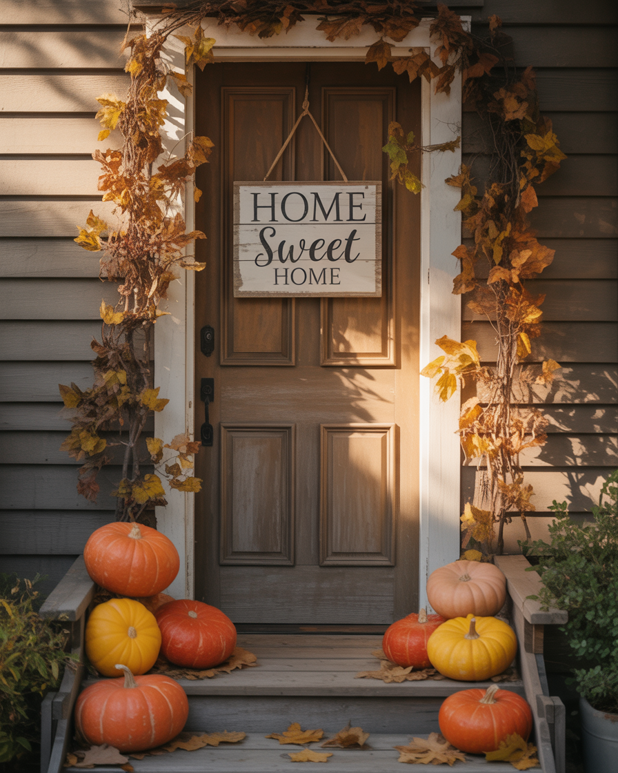 If you have scrap wood or pieces of old countertops, turn them into a rustic welcome sign. Apply fall colors to it or stencil a warm welcome such as “Harvest Time” or “Welcome Home.” Place it against a door or put it against a planter. This diy project combines charm with upcycling and brings an earthy, lived-in vibe to your porch.