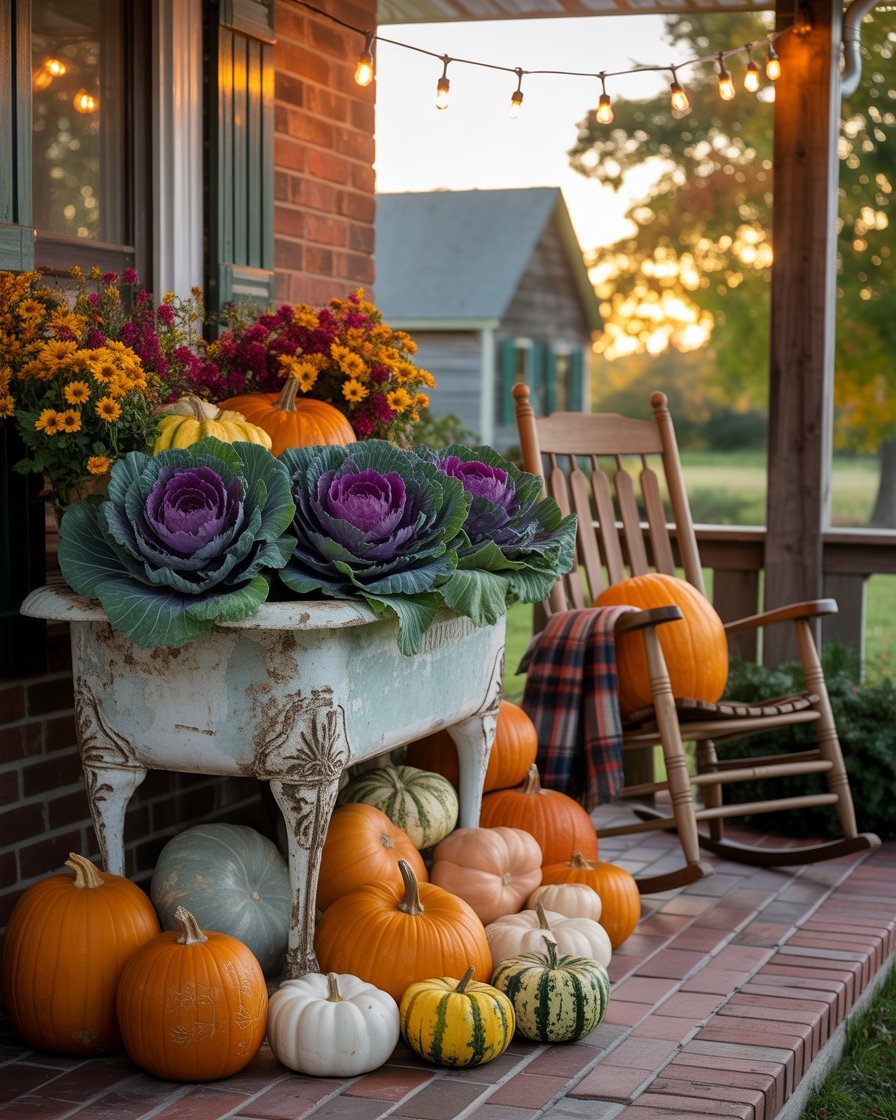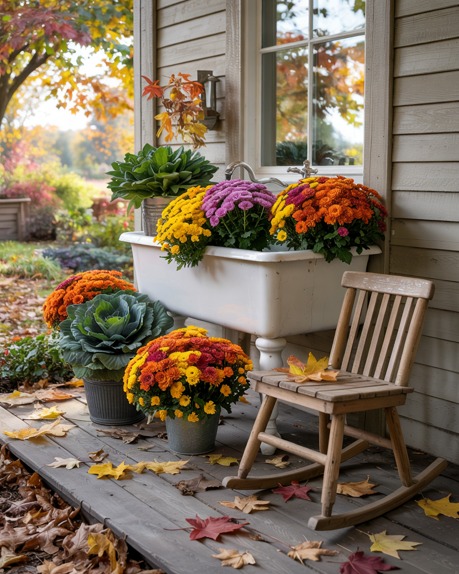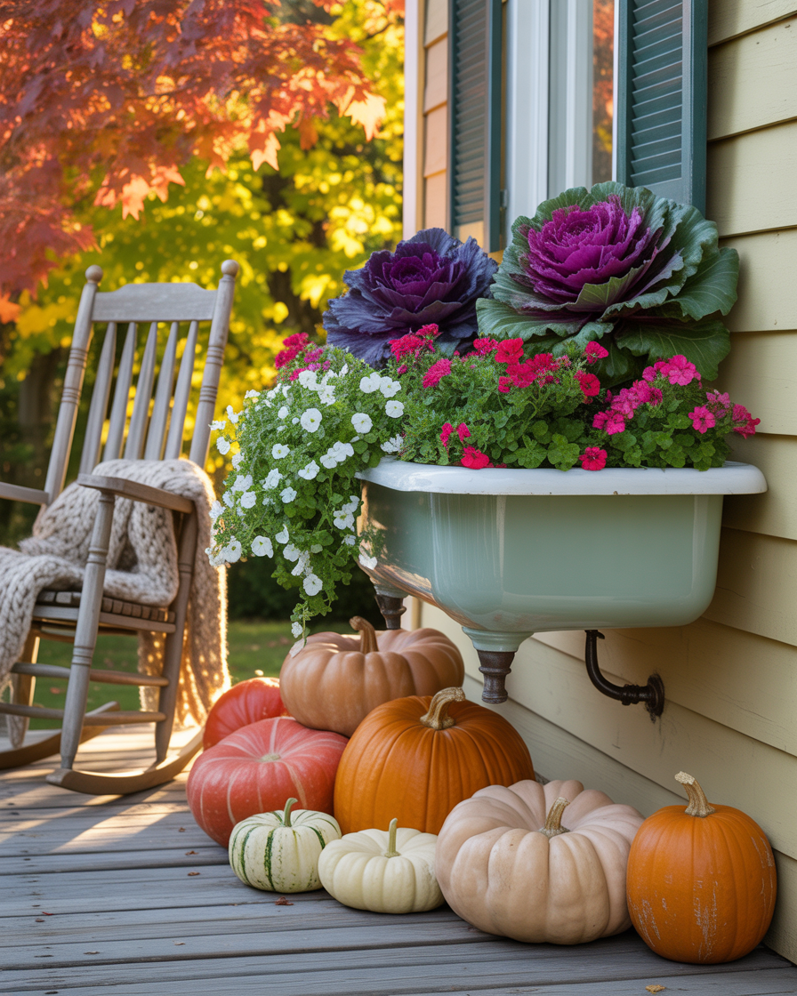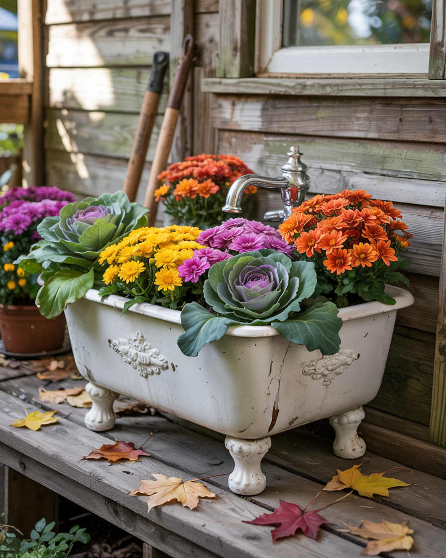 Repurpose an old bathroom or kitchen sink into a creative fall planter. Just fill the sink with dirt and plant ornamental cabbages, pansies or even small pumpkins on it. It is a showstopper that is used as a vintage inspired light fixture and cleverly makes use of sink dollar stores upcycling. This is a bold idea that truly makes your decor memorable.