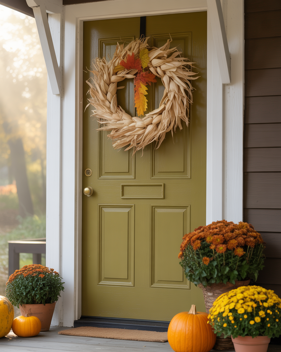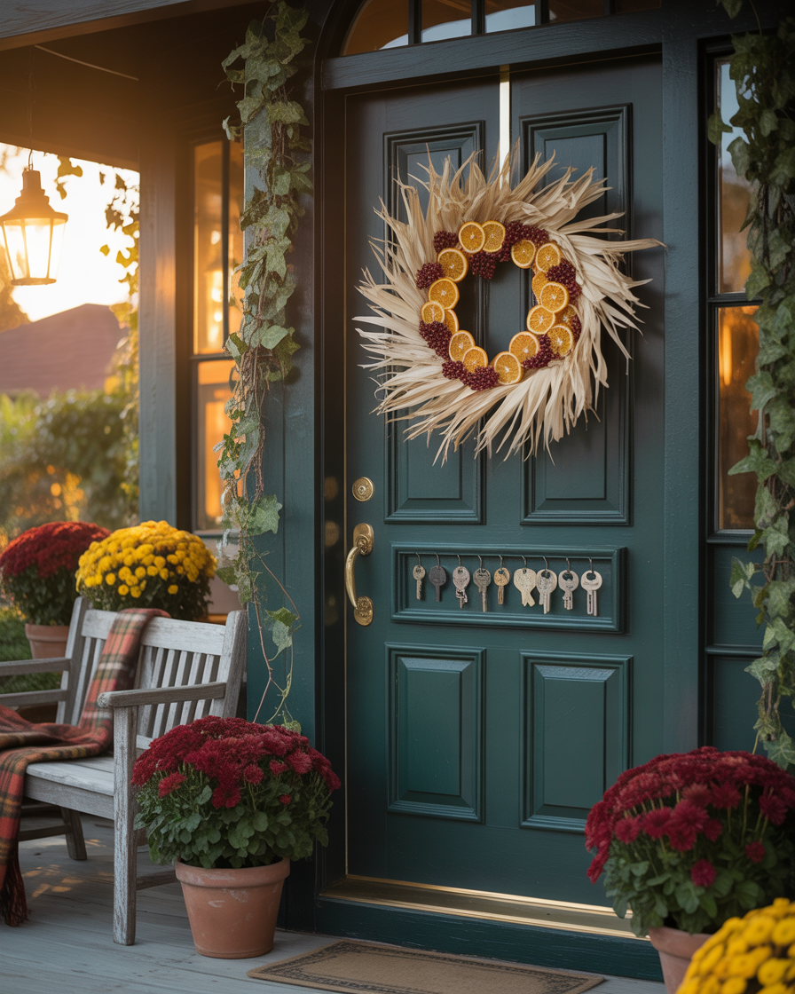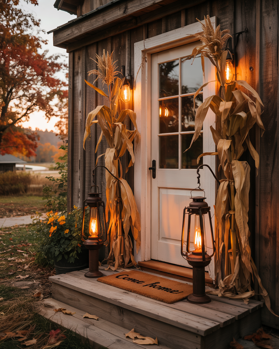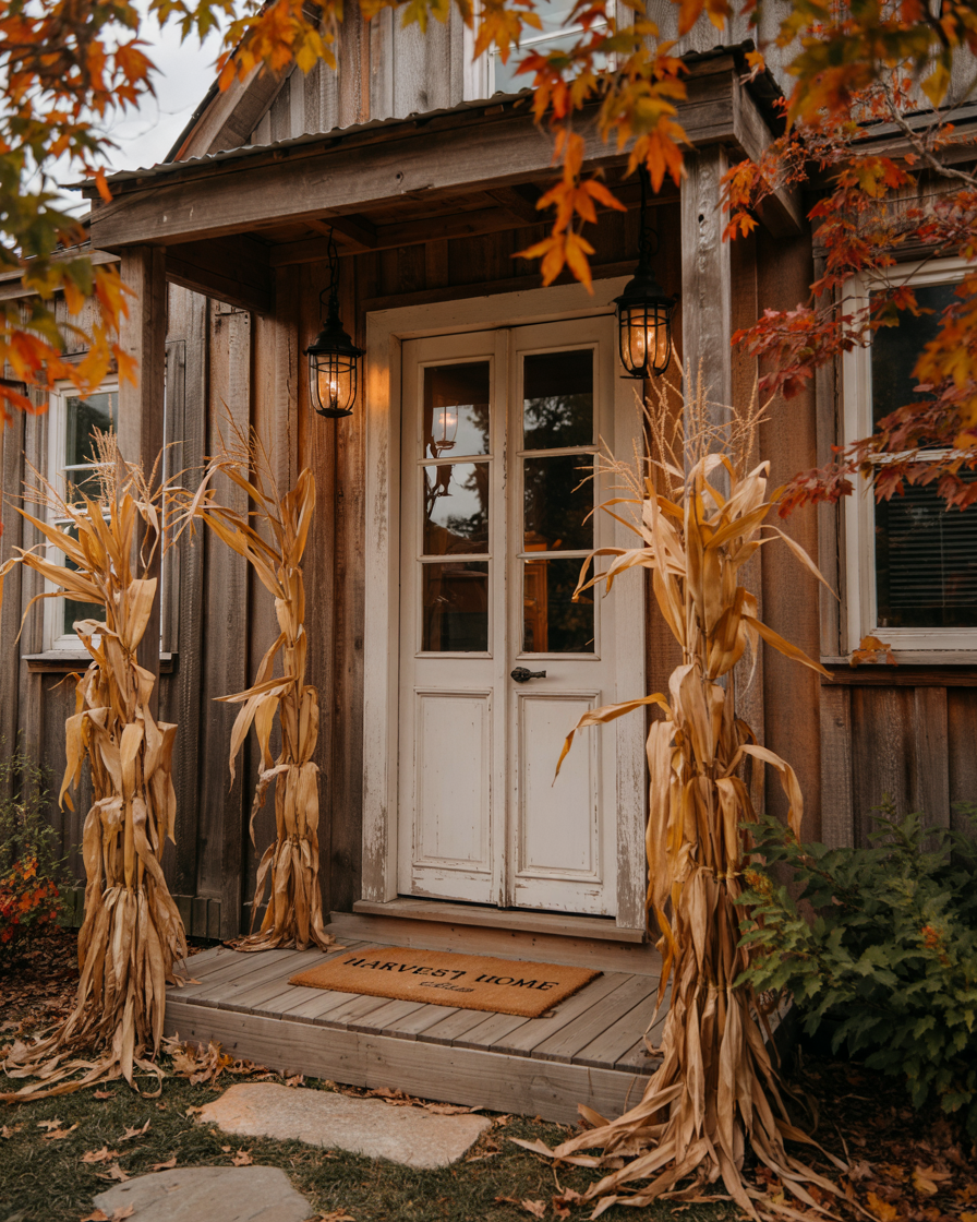 Framing your front door with bundled cornstalks instantly boosts the fall vibe. And top it all with hanging lanterns or string lights. It is a high-impact decor where your house appears celebratory out in the street. Ideal for those wanting something dramatic without heavy diy lifting—just tie, hang, and glow.
