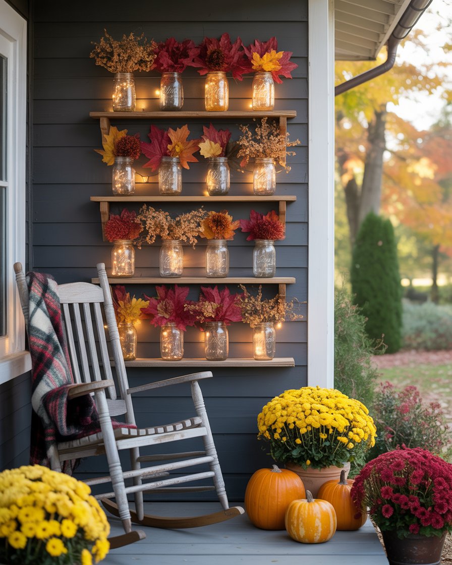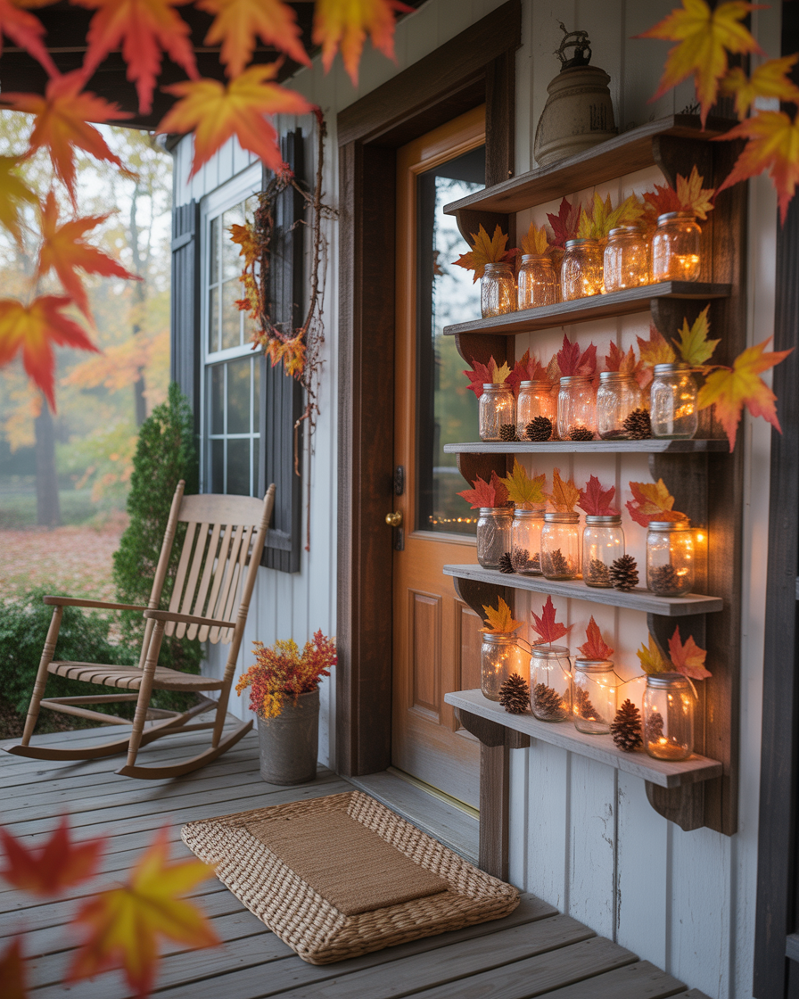 Attach a few rustic wall shelves to the side of your porch or next to the door, and fill mason jars with fall touches—fairy lights, cinnamon sticks, acorns, or mini leaves. This project is easy to do with dollar store materials and adds vertical interest without using floor space, making it ideal for ideas space saving enthusiasts.